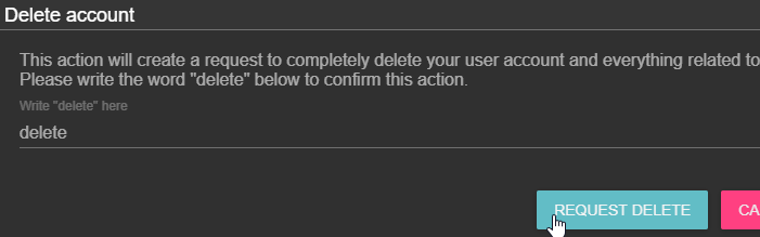 Write “delete” to confirm you really agree to delete everything from your account and click on “REQUEST DELETE”: