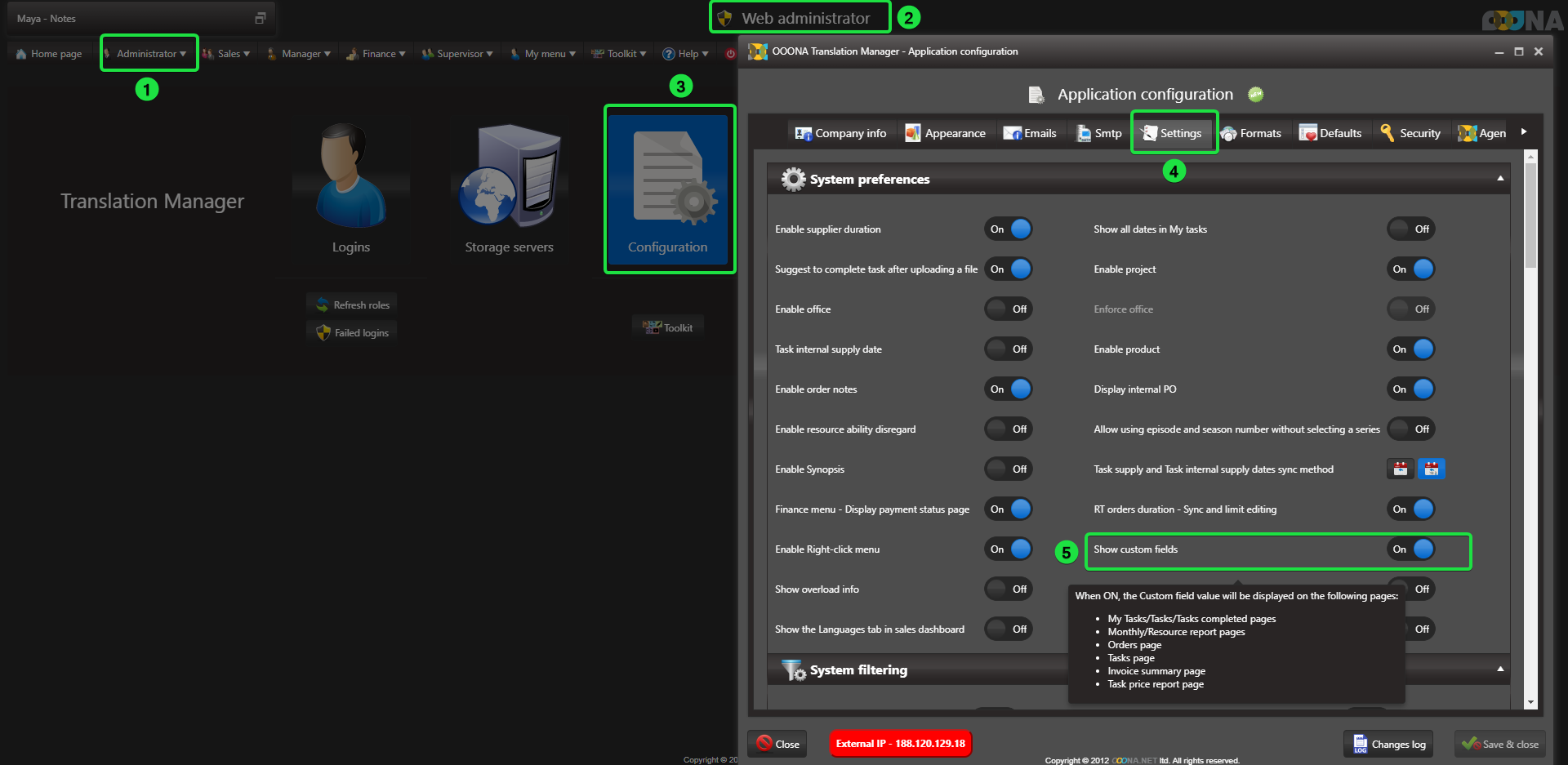From: Administrator > Web administrator > Configuration > Settings > System preferences section > Show custom fields switch