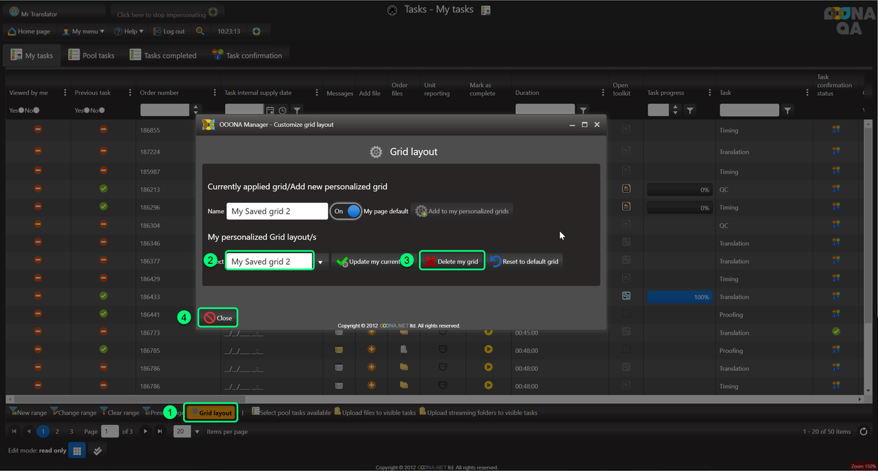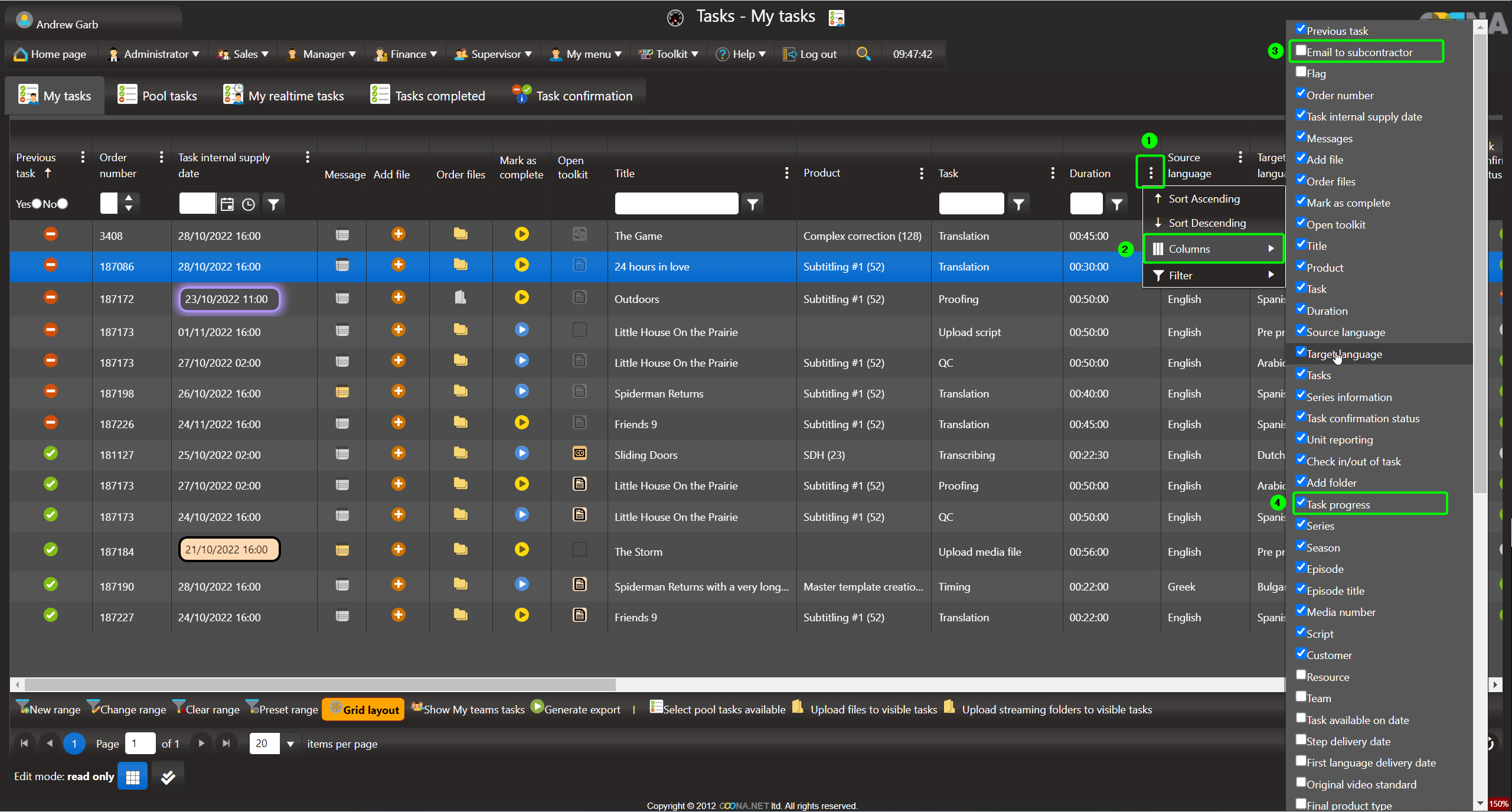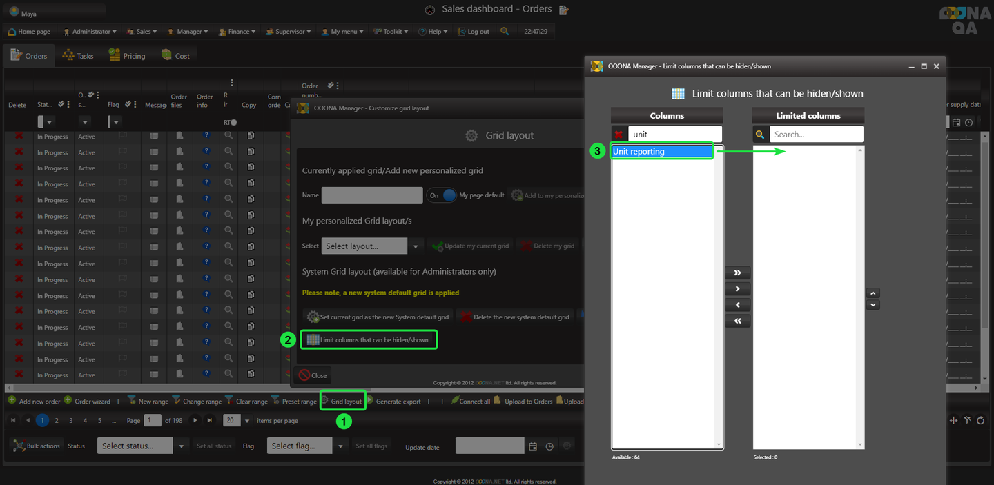 On all OOONA manager pages, the grid layout is customizable, allowing you to show, hide, re-position or change the width of the columns according to your preferences.