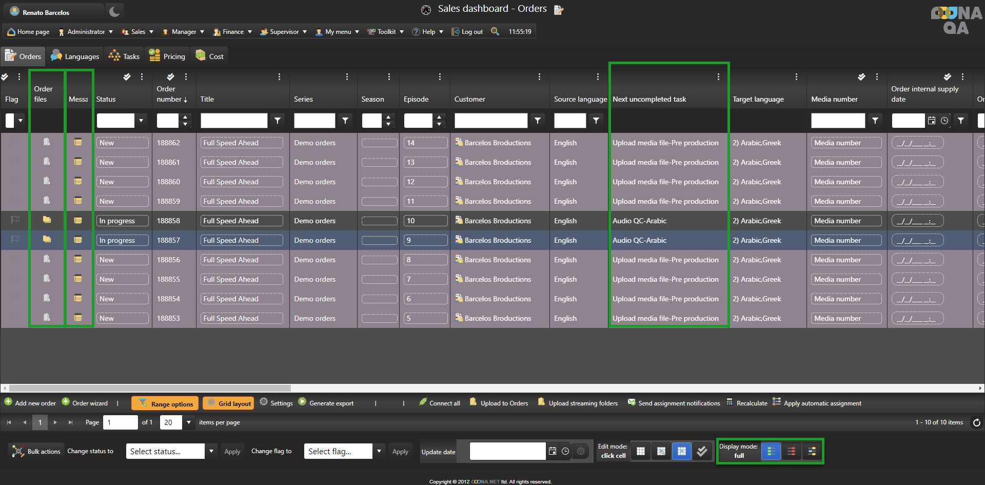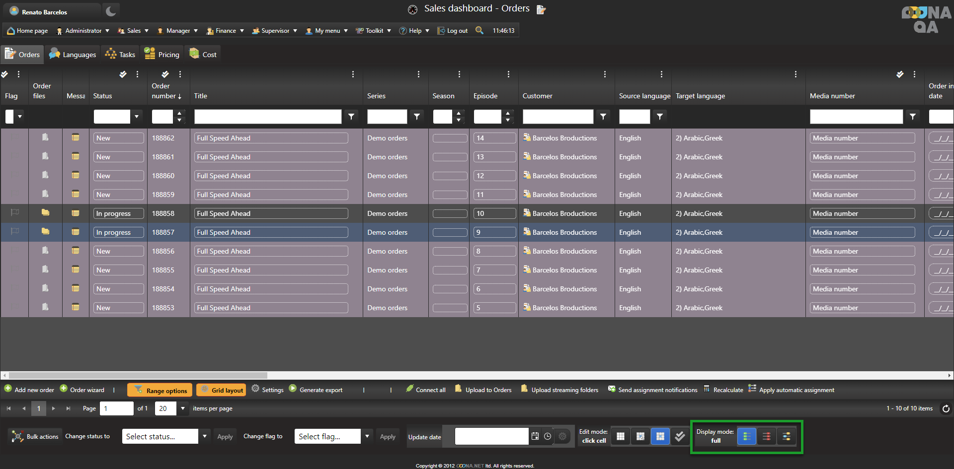 The display mode is a new option added to the Sales dashboard (Orders, Languages and Tasks tabs) that enables the speed of the page to be improved by reducing the amount of live data the system loads when using these pages.
