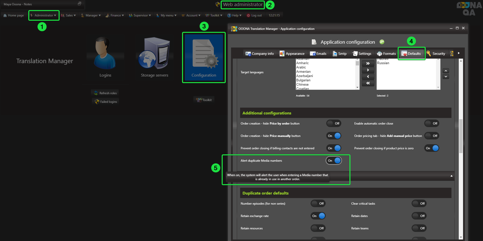 Configure from: Administrator > Web Administrator > Configuration > Defaults > Alert duplicate Media numbers switch (fig 5):