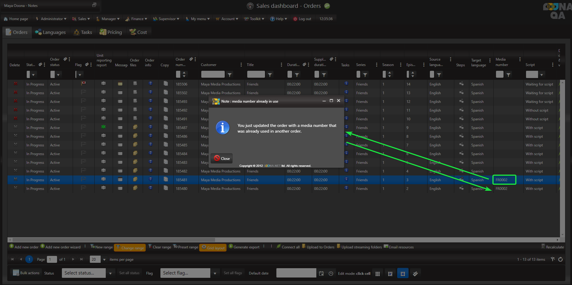 The system can alert users when creating or updating an order with a Media number that is already in use in a different order.