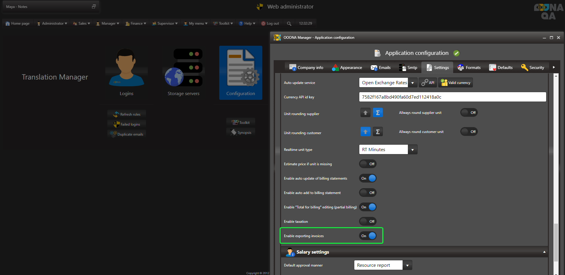Enabling Invoices export in the system