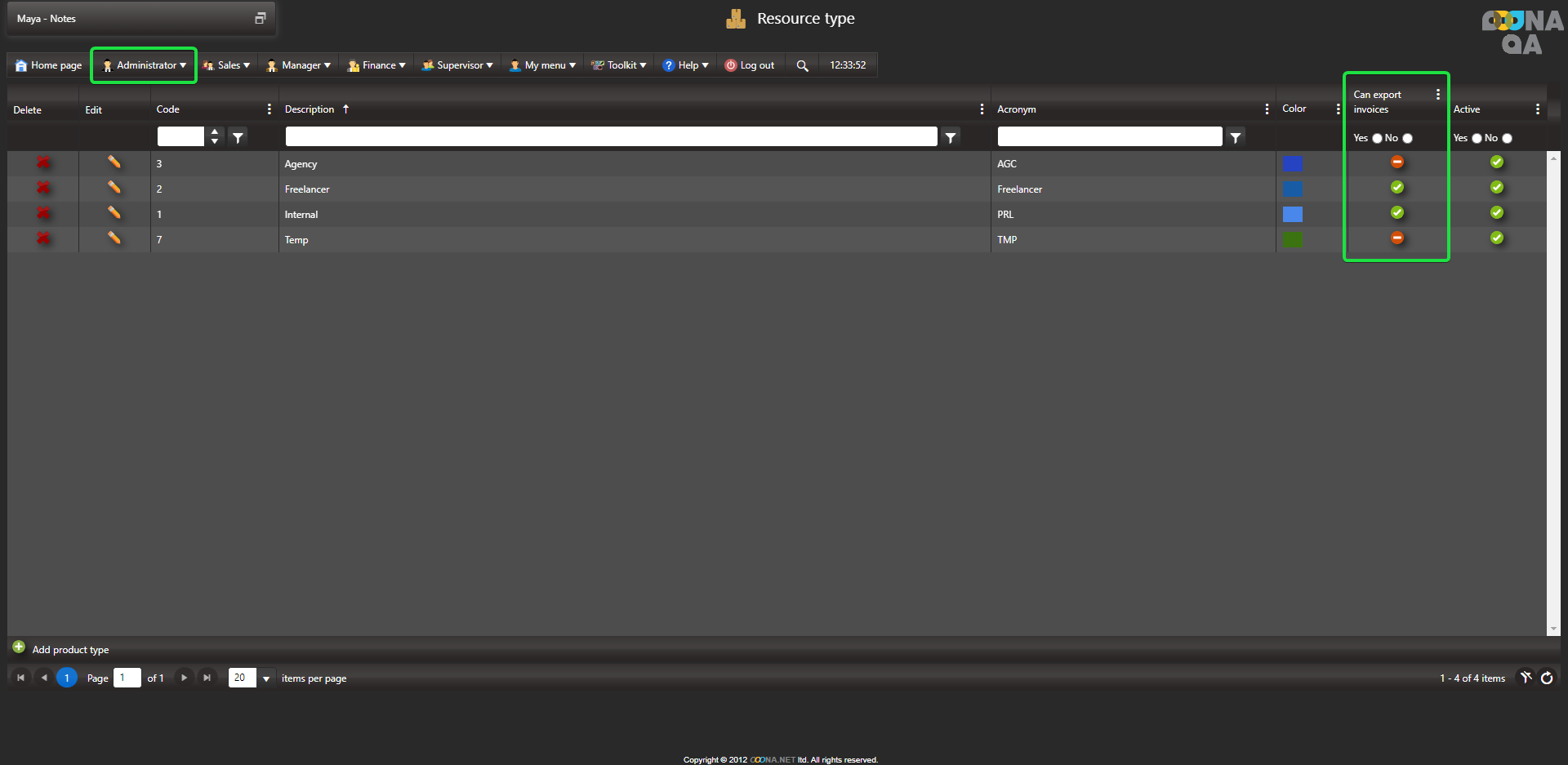 2. Determine which Resource types can export invoices.