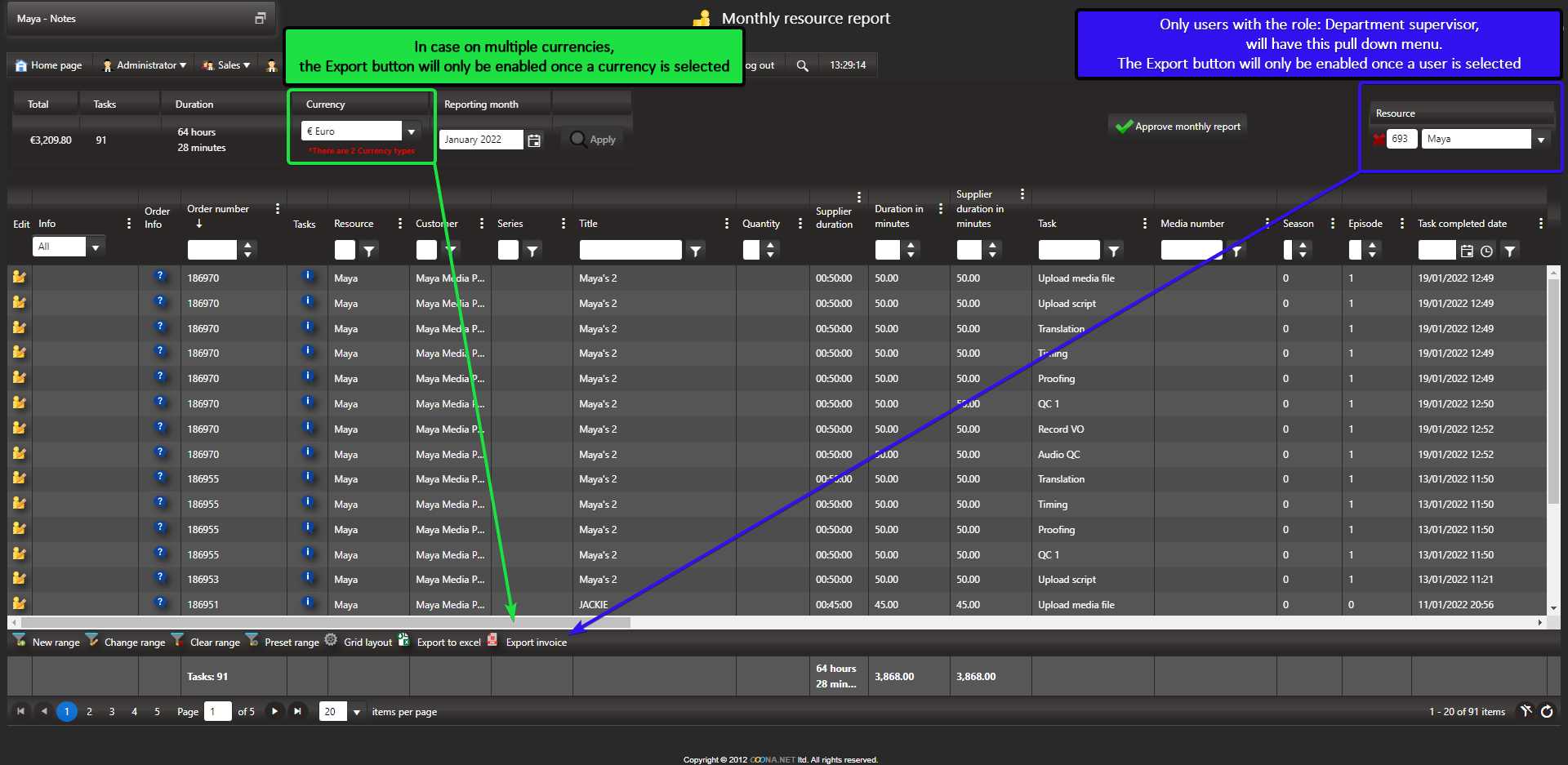 The invoice can be exported by the resources or for them.