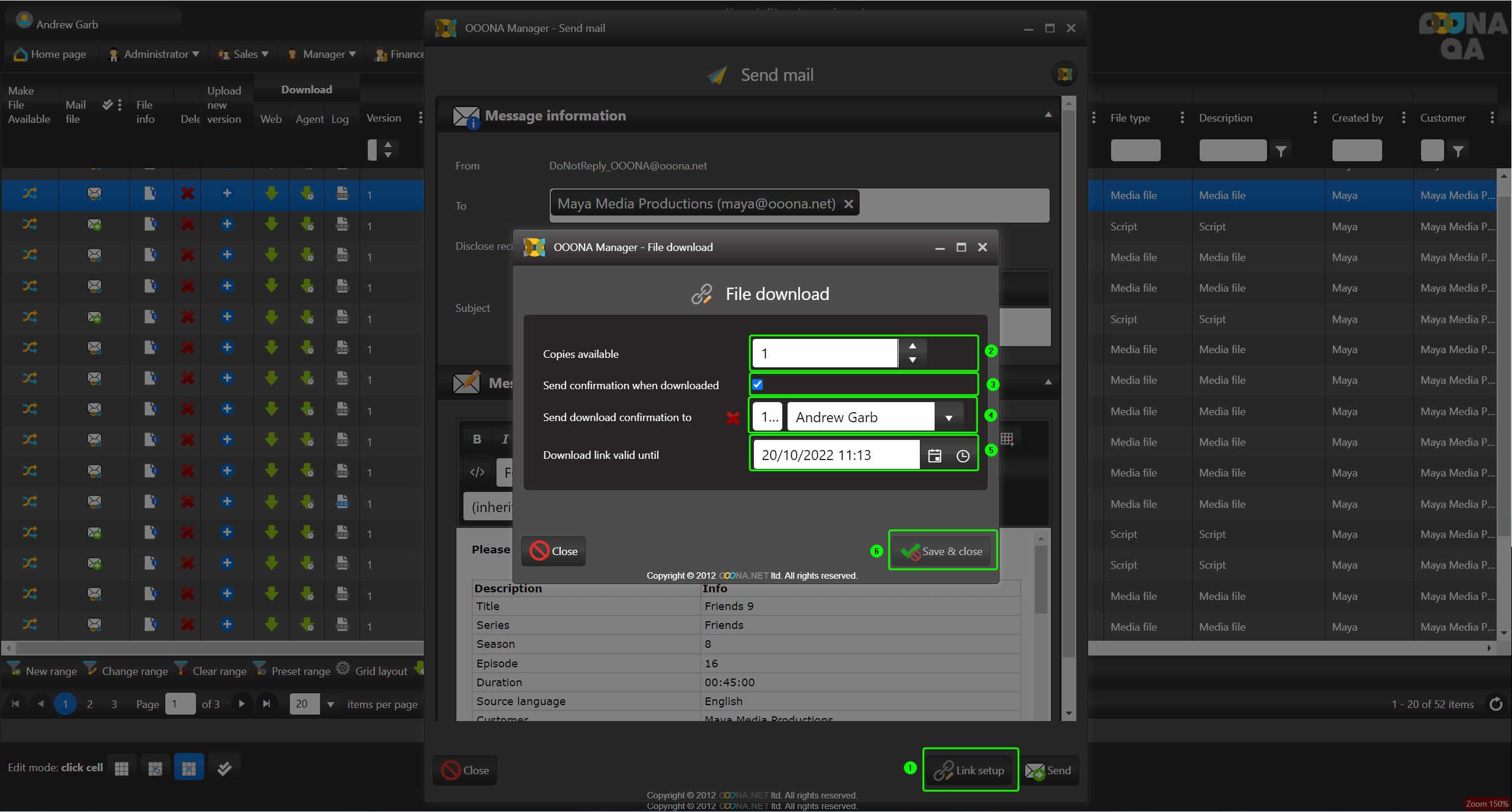 Files can be delivered via email as attachments or as a link for download. The “Send mail” page can be accessed from numerous locations in the system.