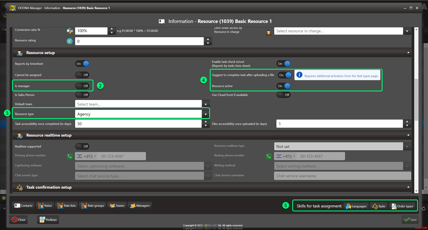 Set which tasks the resource can be assigned to using the “Languages” or “Language pairs”, “Tasks” & “Order Type” buttons (fig 5)