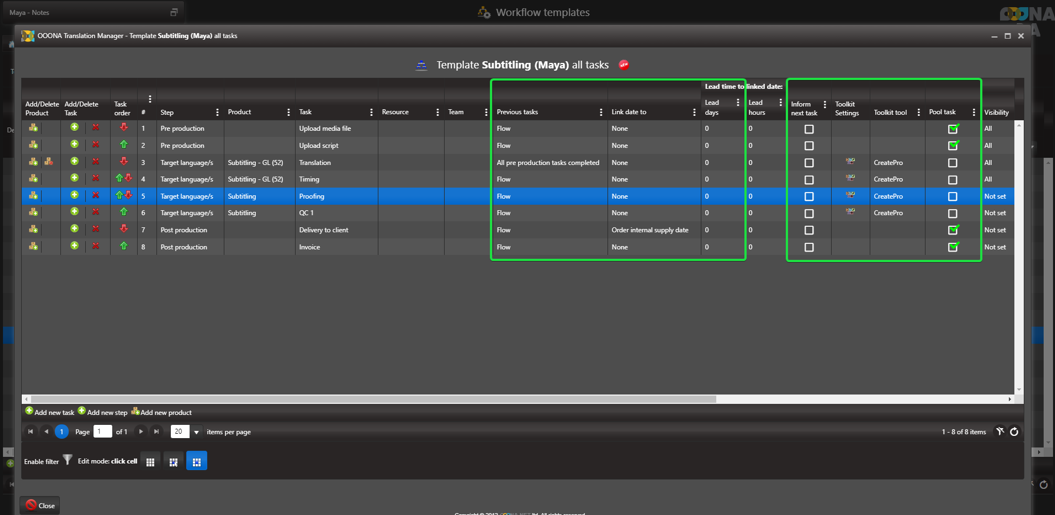 Previous task, Link date to, Lead days, Inform next task, Toolkit settings, Toolkit tool, Prod task & Upload defaults.