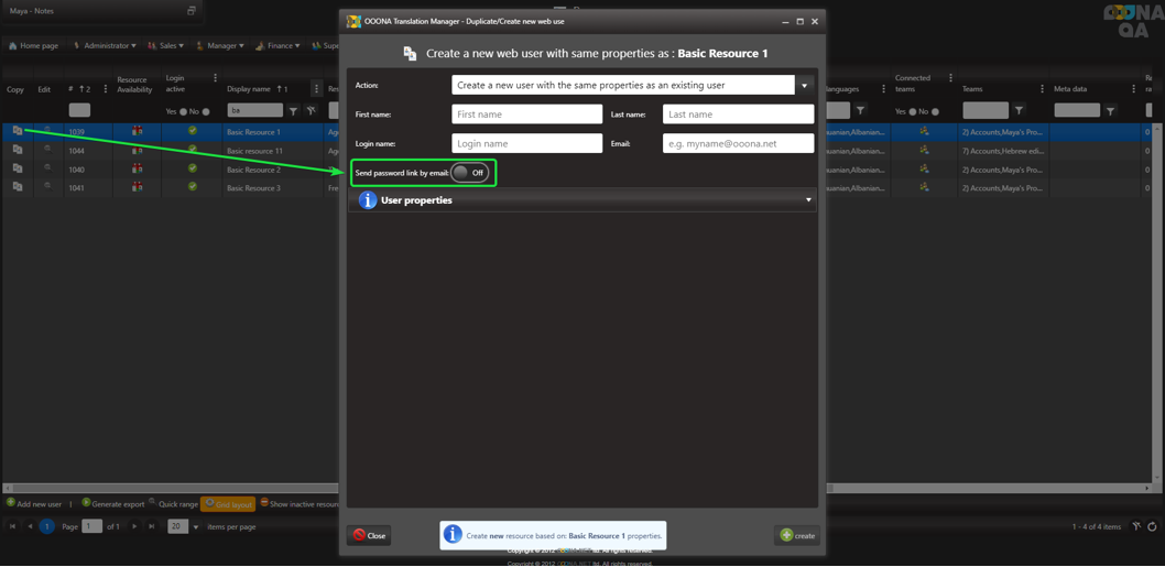 If you don’t want them to currently receive OOONA’s welcome mail with their username, switch off “Send password link by email” in the Resource copy page (in some systems this might be displayed as a checkbox).