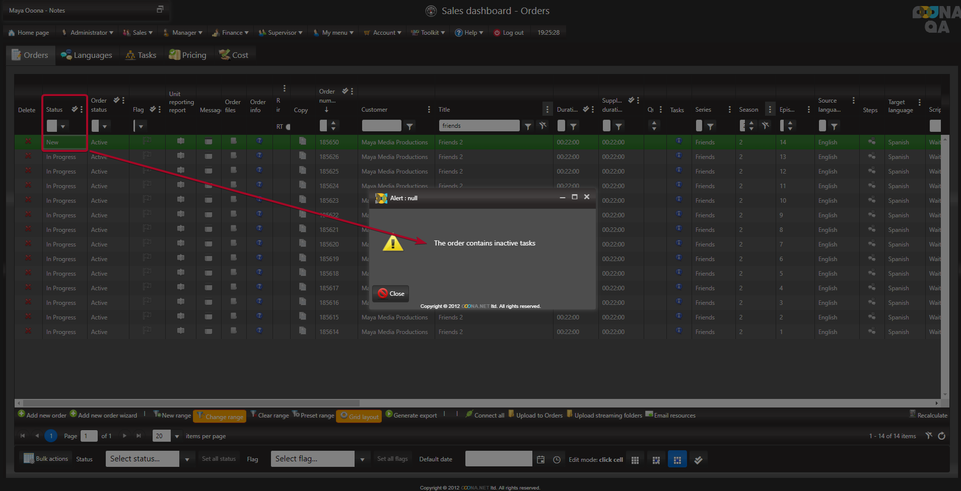 If an order contains inactive tasks when trying to change the status from “New” to “In progress” the following alert will be displayed and the status will not change.