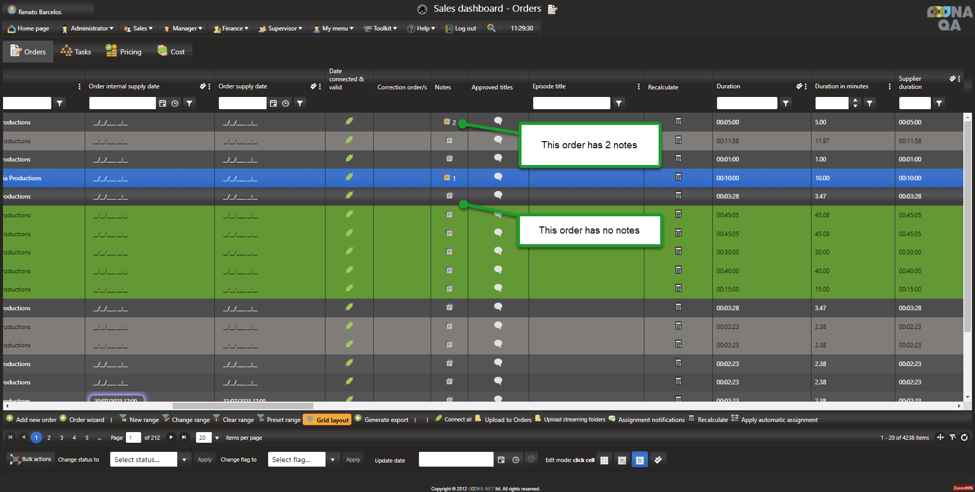 The Order notes page will show all orders within the project, showing orders with notes first by default: