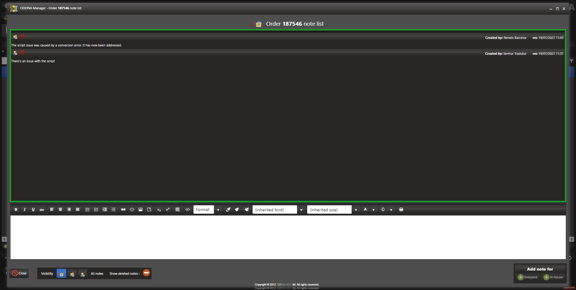 Notes enable users to create order notes (“in-house” or “everyone”) that do not need to be read or completed to download files.