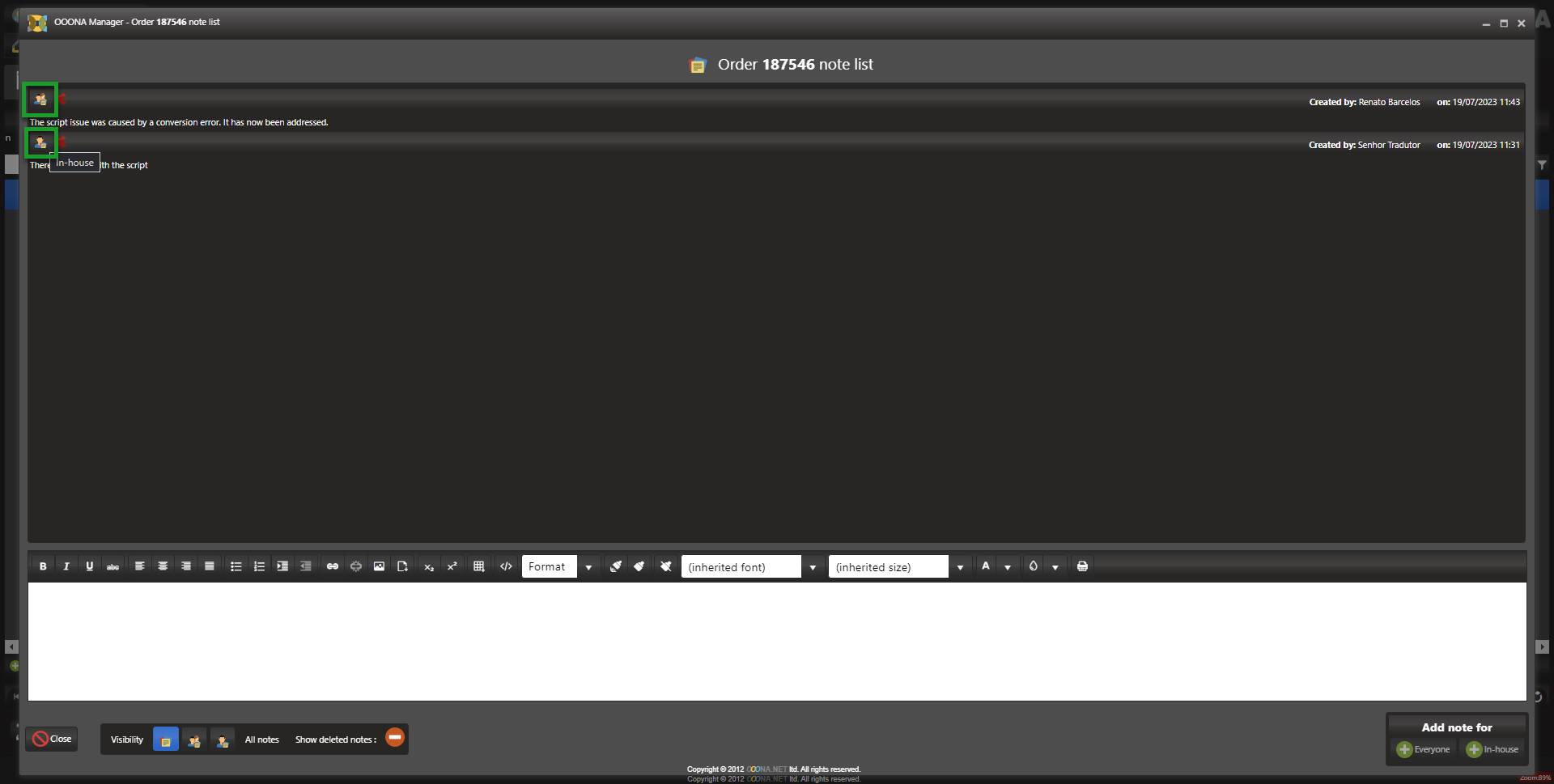 The icons on the left indicate if it’s an “Everyone” or “In-house” note: