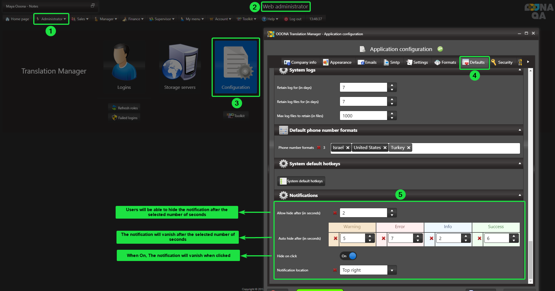 System defaults can be set to determine the duration of the notification before they vanish, the location of the notifications on-screen, and the minimum duration before a user can close the notification.