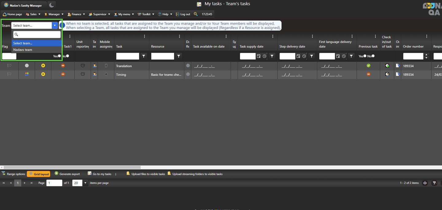Since managers can manage more than one team, to see the tasks matching a specific team, choose the relevant production team from the “Team” dropdown menu in the top left corner of the page.