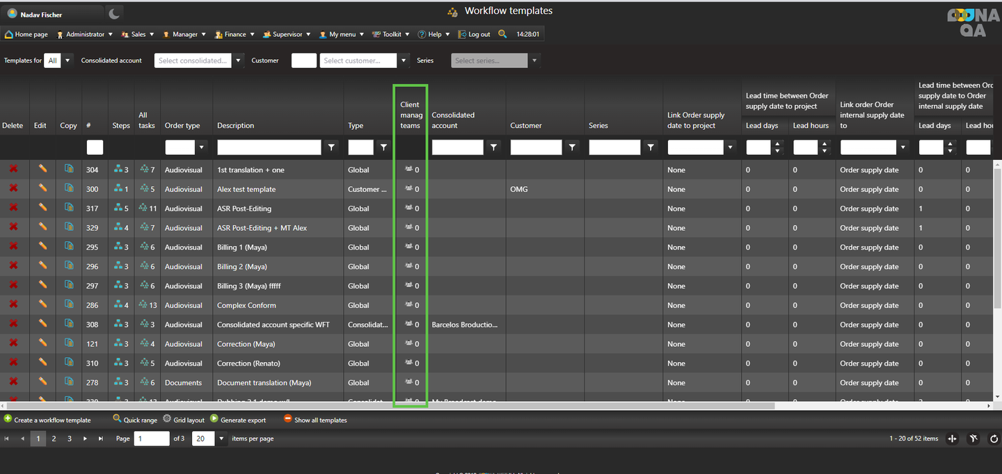 For that, go to Manager > Price lists & workflow templates > Workflow templates. Locate the template you wish to associate to the client manager team, go to the client manager teams column and select the team.