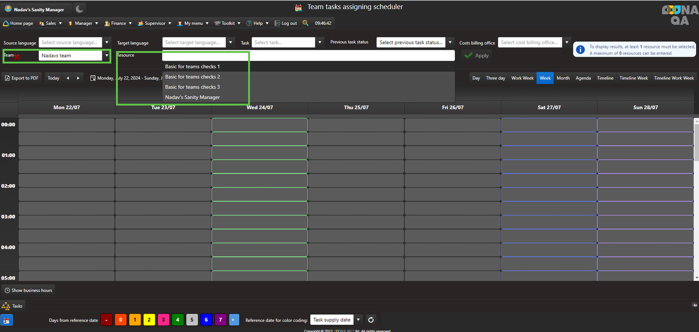 In Supervisor > Schedule > Team tasks assigning scheduler, choose a Production team from the “Team” dropdown menu. Only resources from that production team will be shown in the “Resource” dropdown menu, allowing for an easier view of the resources.