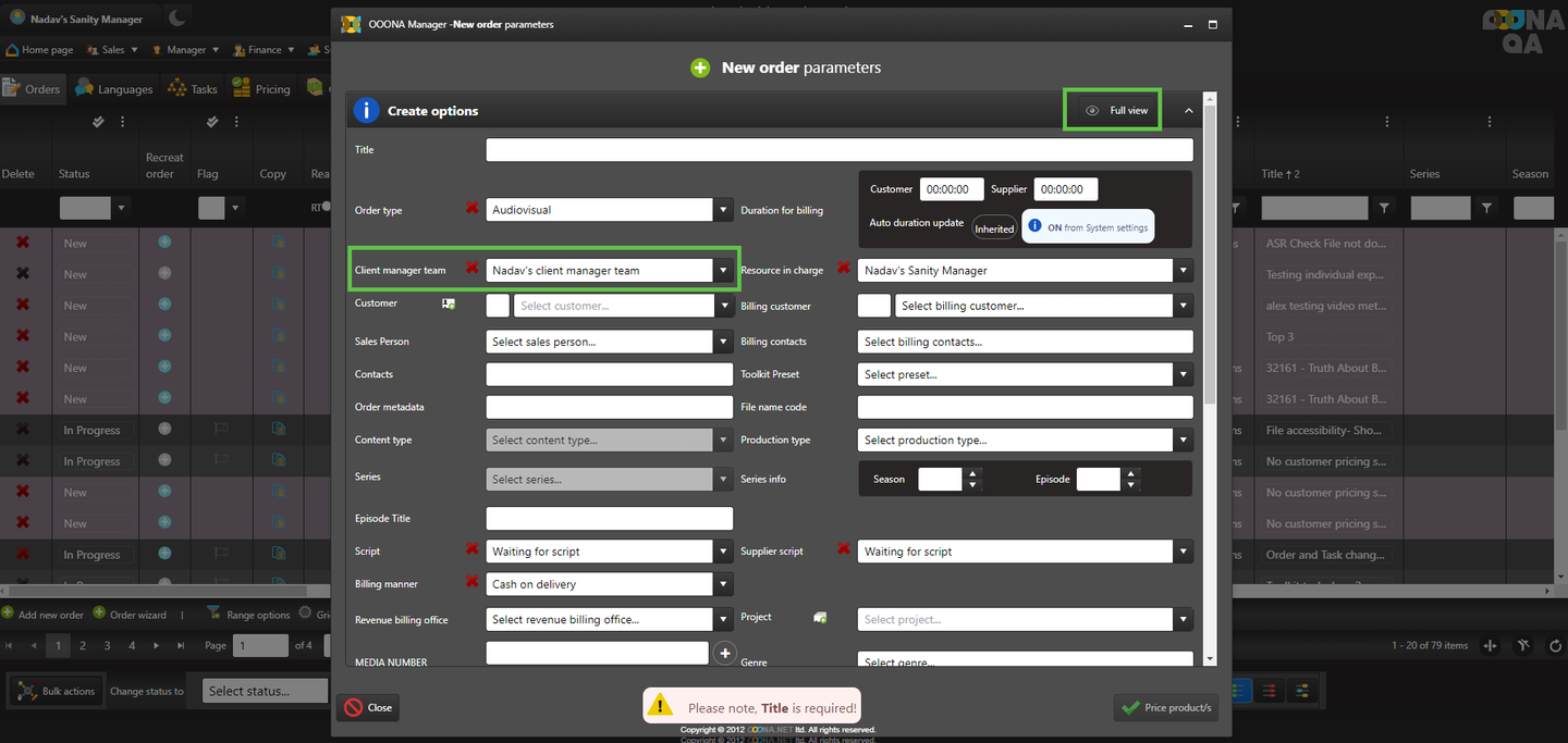When creating a new order, switch to the full view to see the client manager team field.