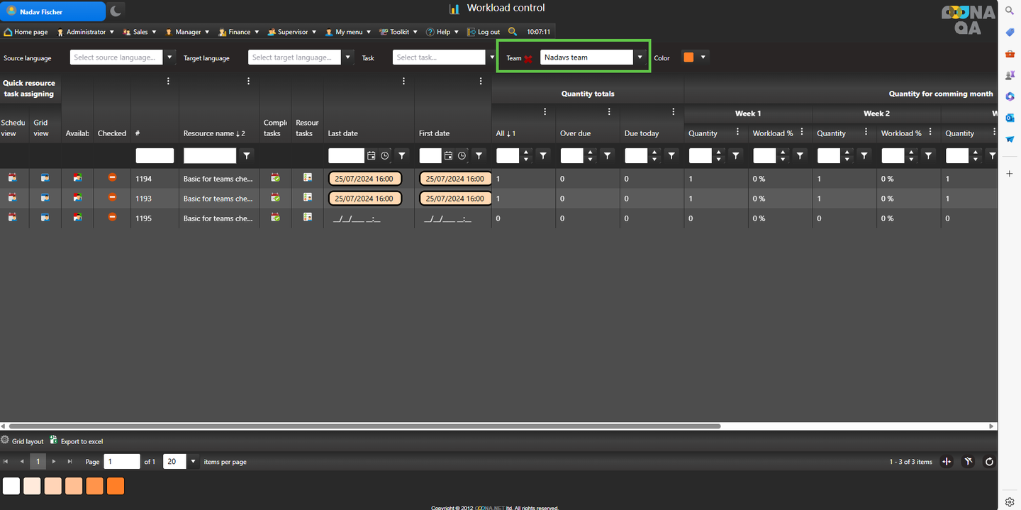 In the example below, Nadav’s Production team is assigned and only the three resources that were added to the team are visible.