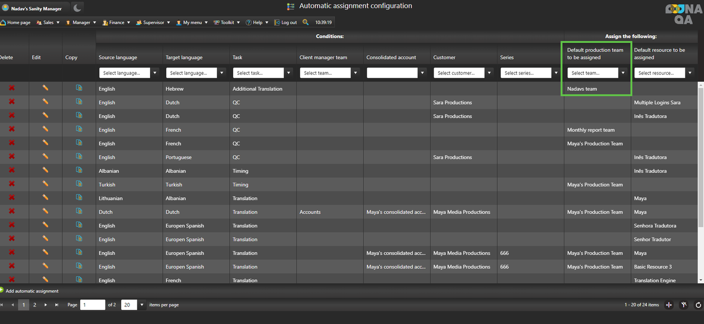 Production teams can also be automatically assigned to specific tasks. For that, go to Manager > Price lists & workflow templates > Automatic assignment configuration and choose a production team from the dropdown menu under the “Default production team to be assigned” column.