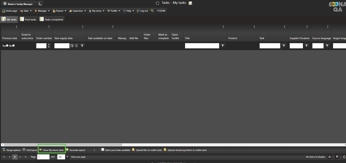 From My menu >My tasks page, the production team manager will have access to the “Show My teams tasks button at the bottom of the page.