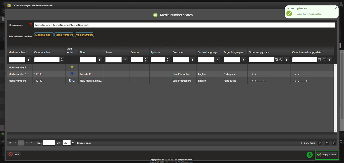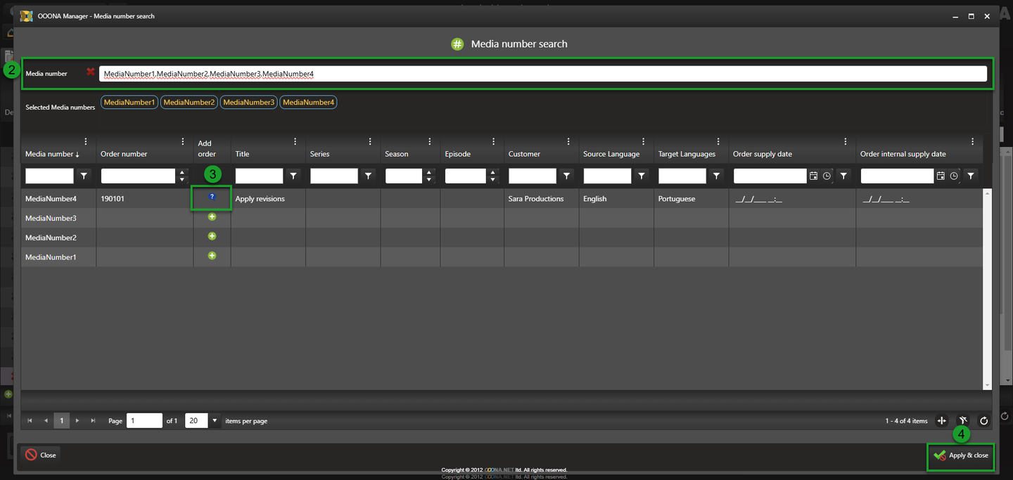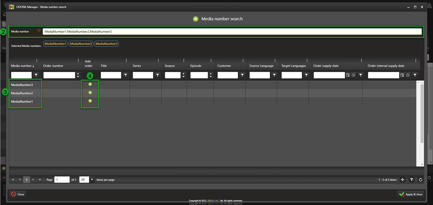 After adding the required media numbers, they will be listed in the grid below (3). If there are no orders with the selected media numbers, an order can be added by clicking the icon in the “Add order” column (4).