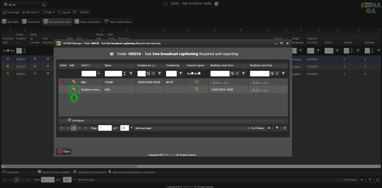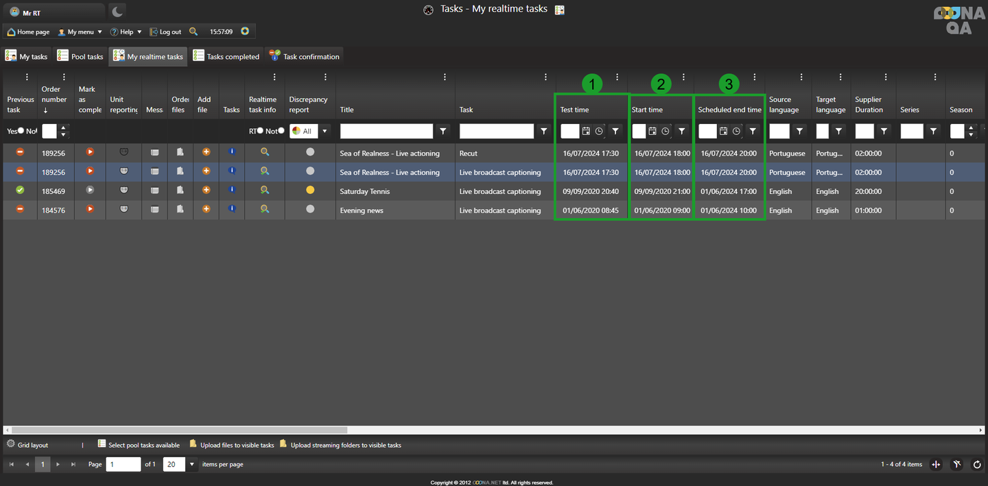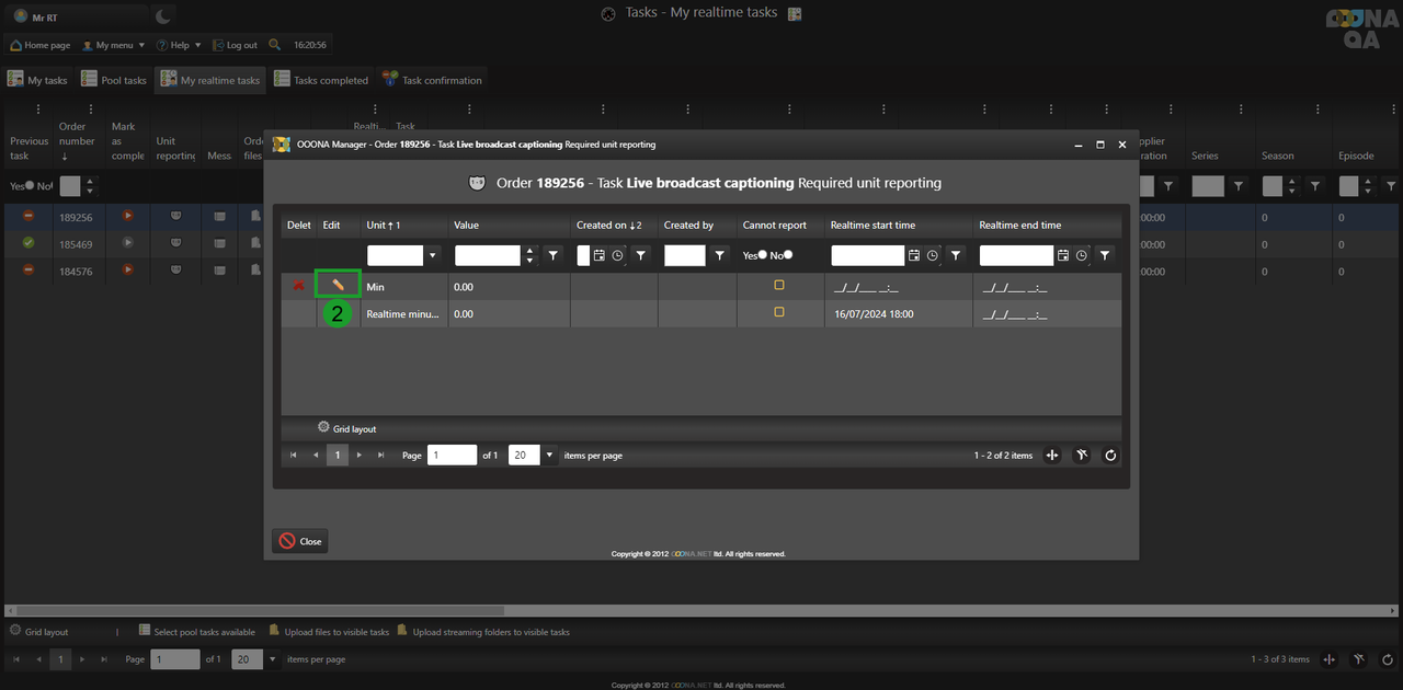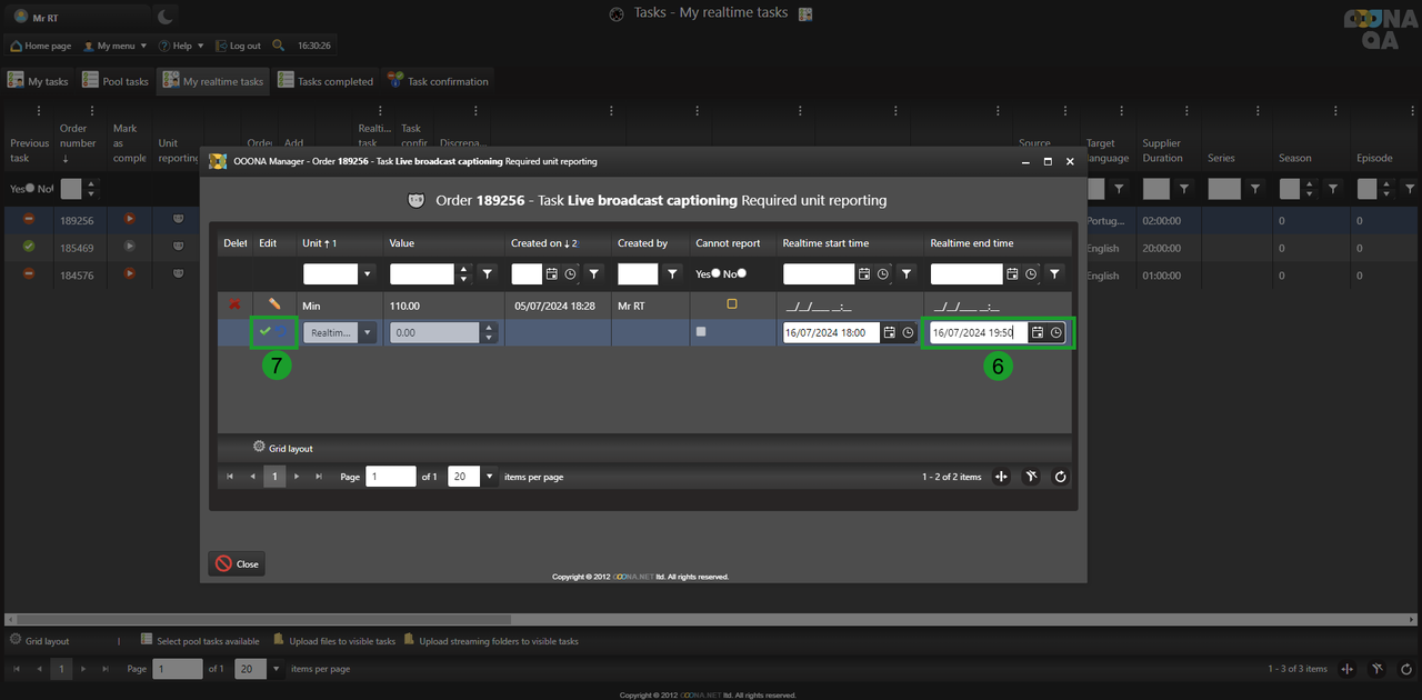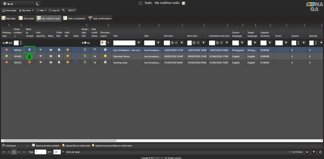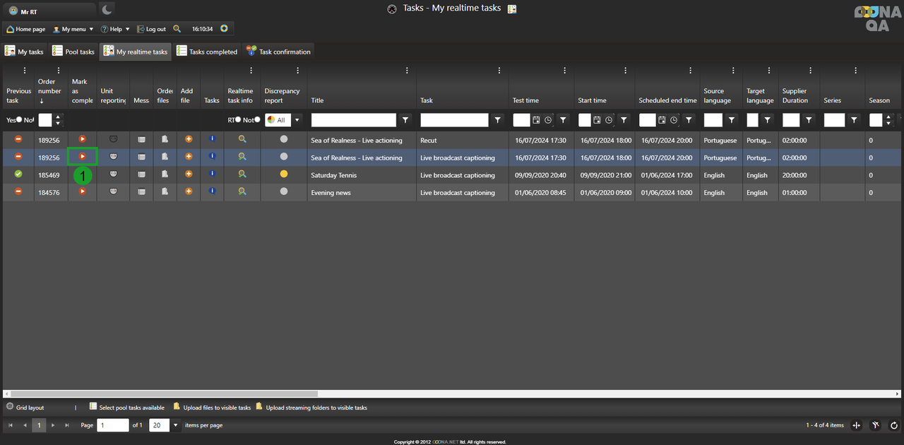 Realtime tasks can be completed using the “Mark as complete” column (1):