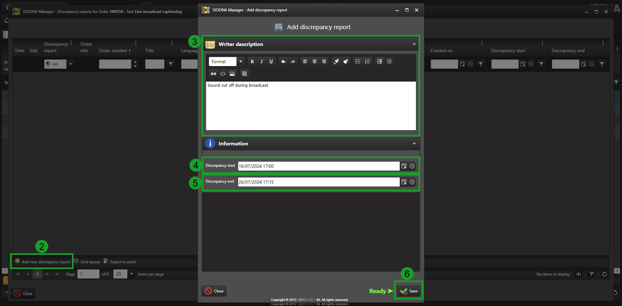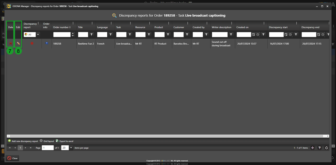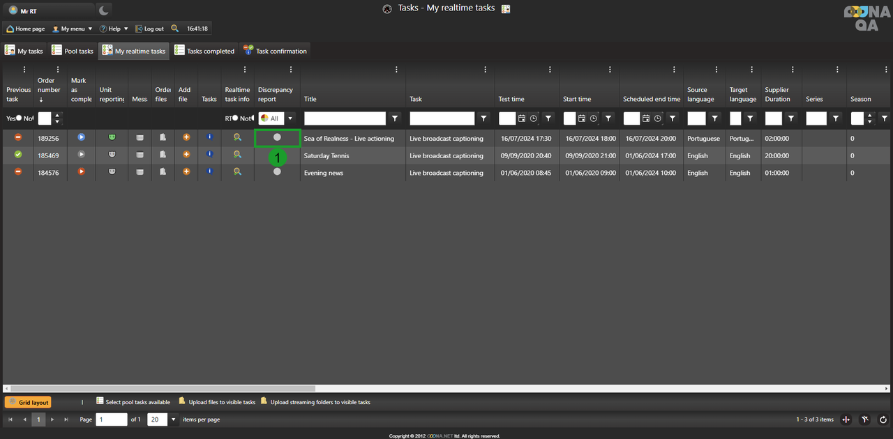 If discrepancies need to be reported, this can be done using the “Discrepancy report” button (1) in the My menu > Tasks > My realtime tasks page.