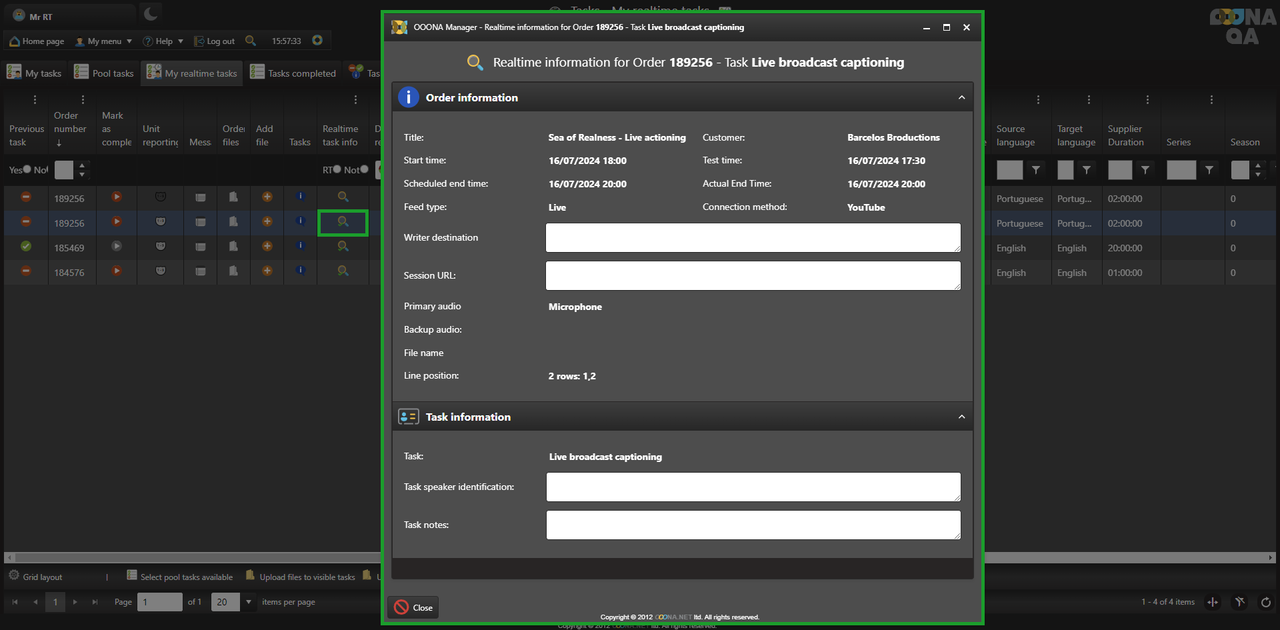 Realtime tasks are tailored for live captioning requests, including options for functionalities such as test times, customer destinations and logging of discrepancies.