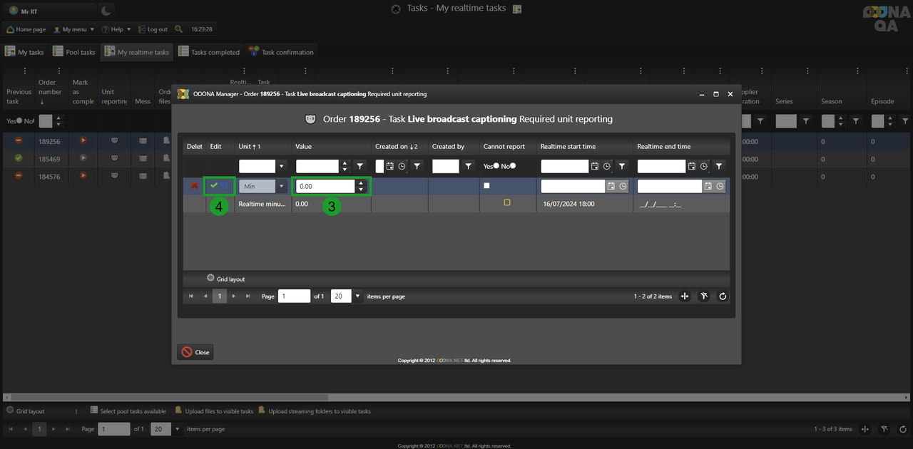 To report the amount of time spent on the task, click on the pencil of the corresponding row (2). The “Value” field will become editable (3).