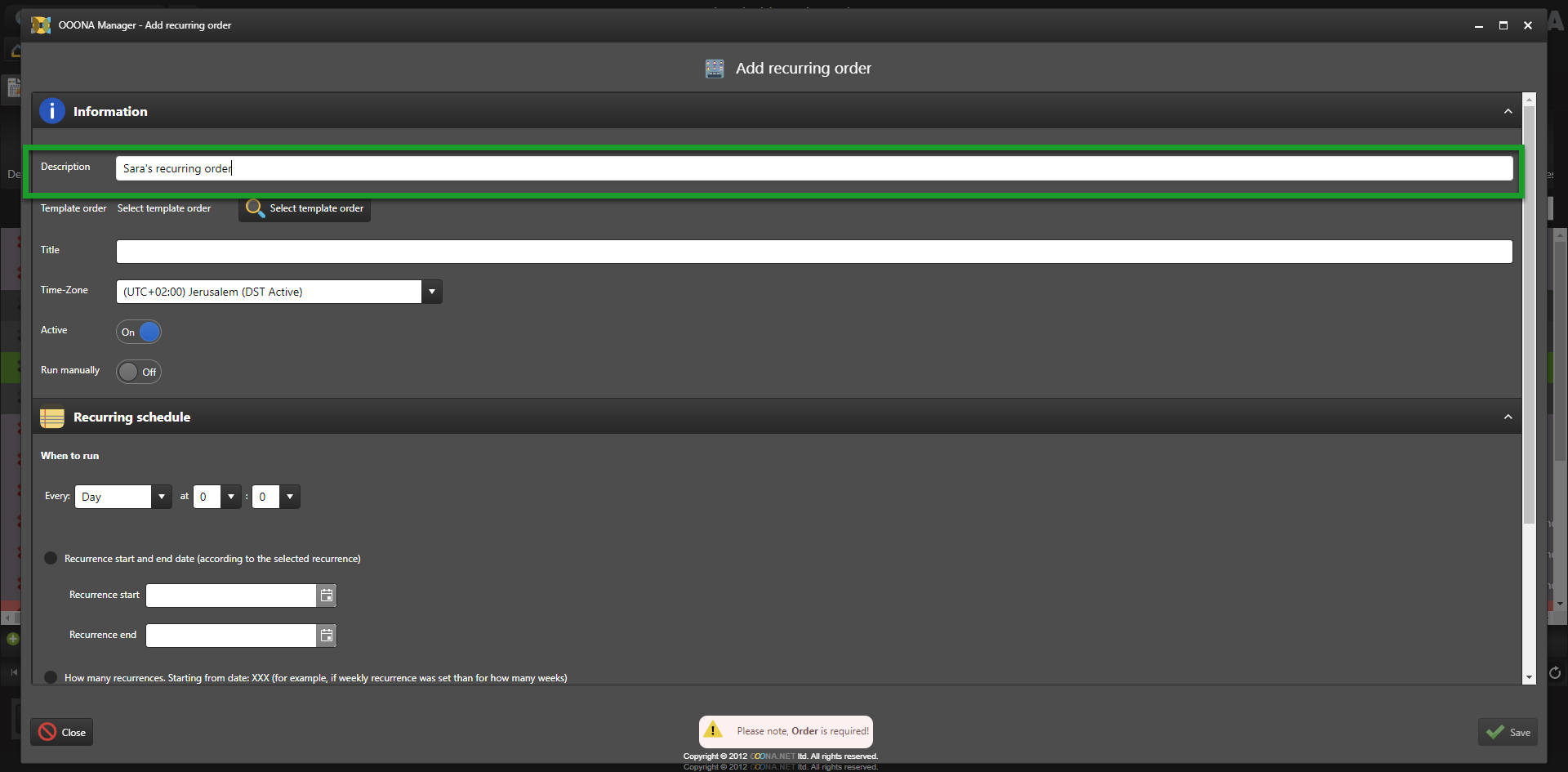 When the “Add recurring order” pop-up opens, fill out the “Description” for the recurring orders automation. This is a mandatory field, but it is not the order title, it’s the description of the recurring orders, which will be shown in the Recurring orders generator list.