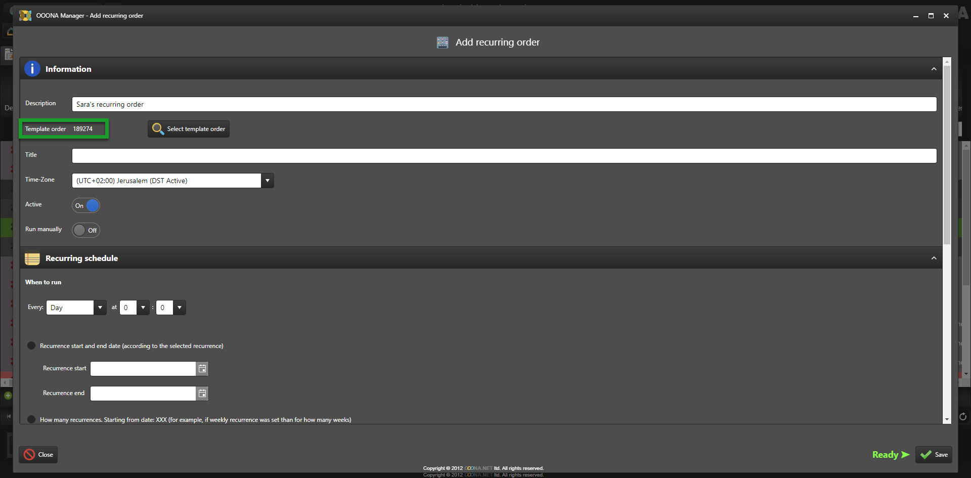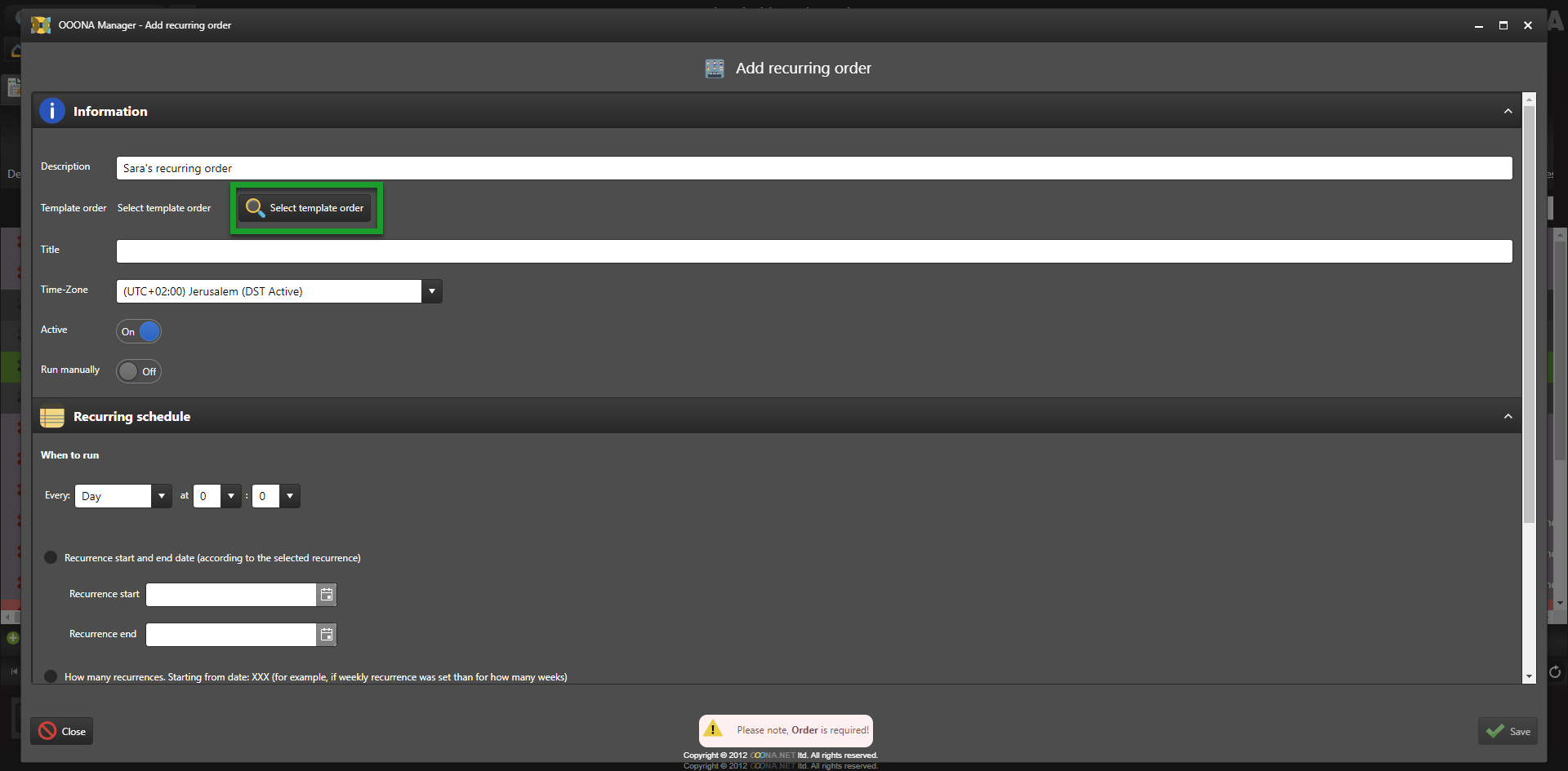Another mandatory field to create a recurring order is a “Template order”, which will be the order copied by the system when creating the recurring orders.
