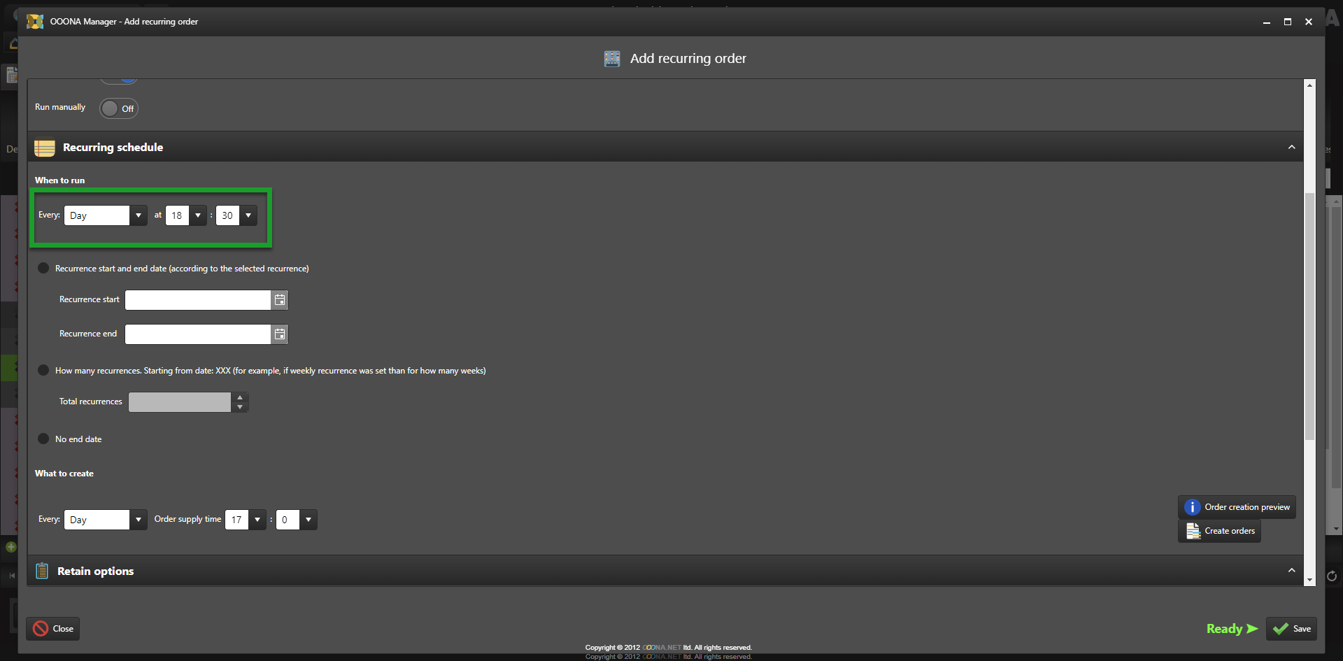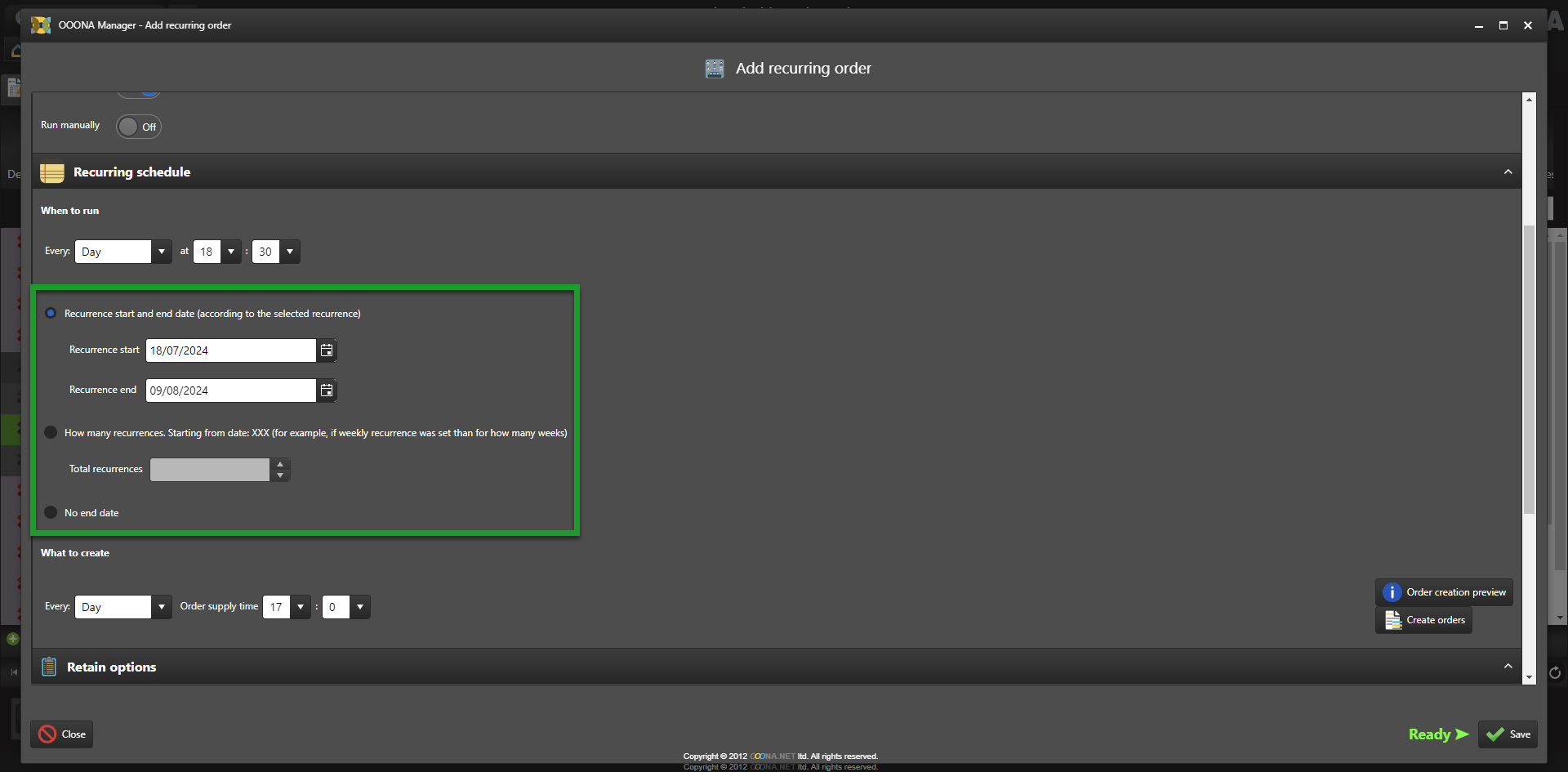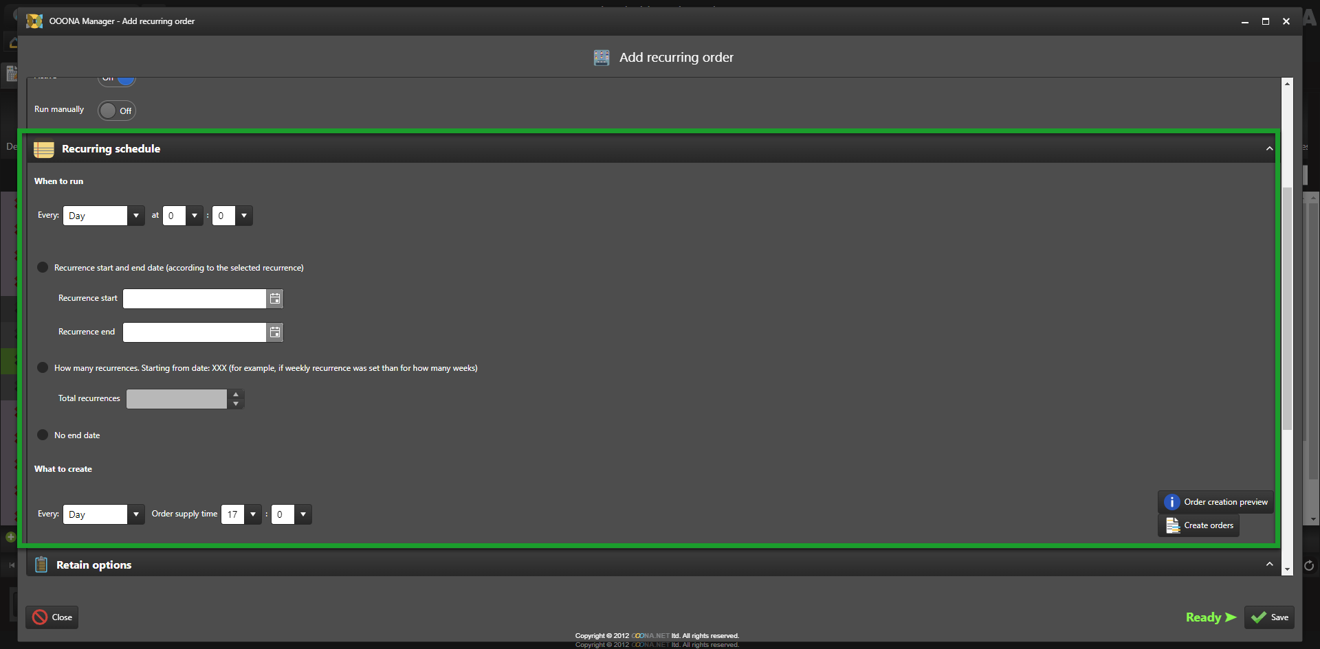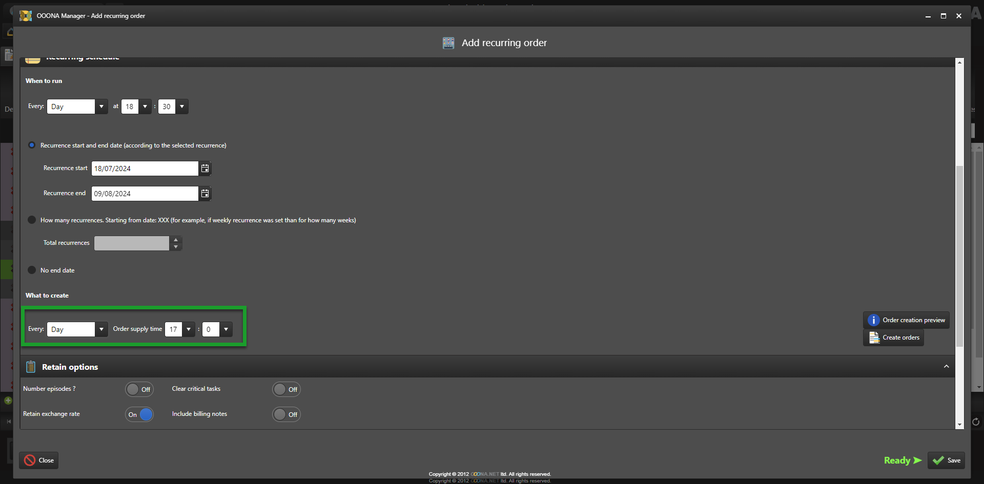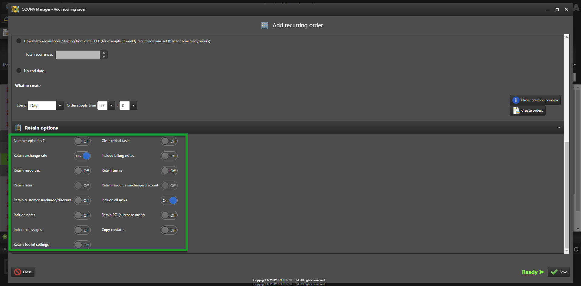 When creating a recurring order, since this feature works as the order copy feature, you can copy additional information from the template order selected. Switch on the attribute you want to copy in the “Retain options” section.