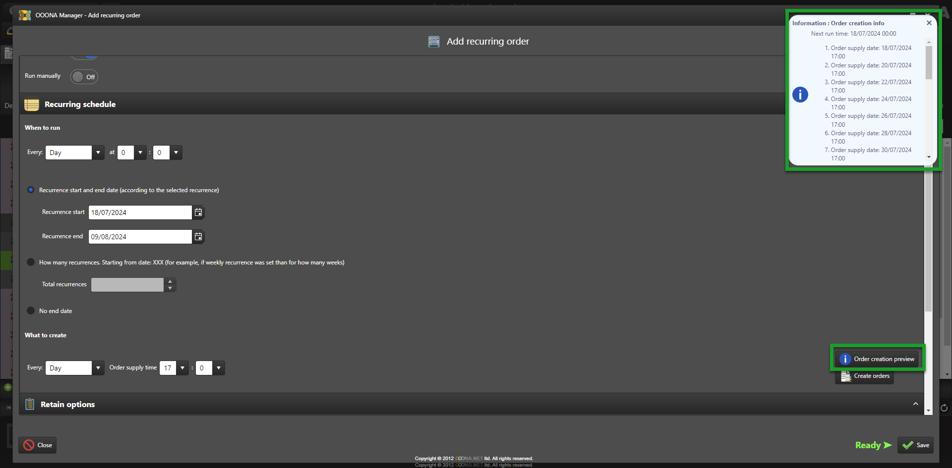 If all conditions are set up, clicking the “Order creation preview” will prompt a message indicating when the next run time is and when the orders will be created.