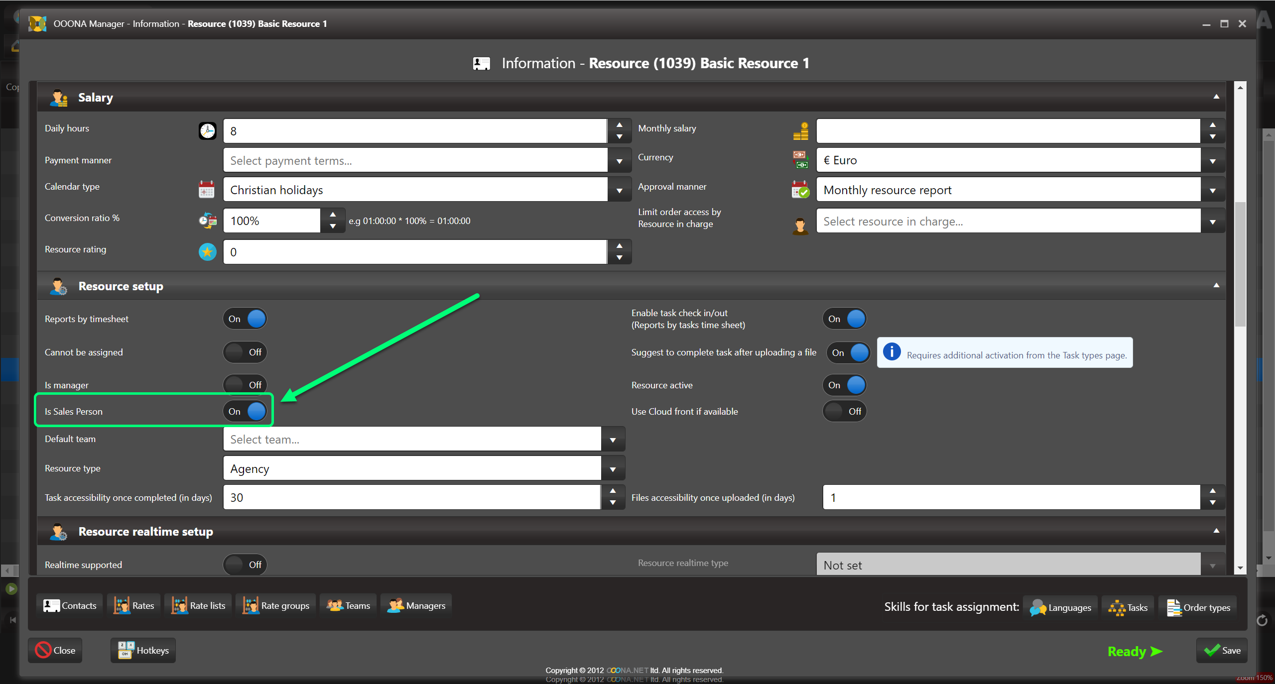 To set a user as a Salesperson, navigate to the Resource information page and set the “Is Salesperson” switch to ON.