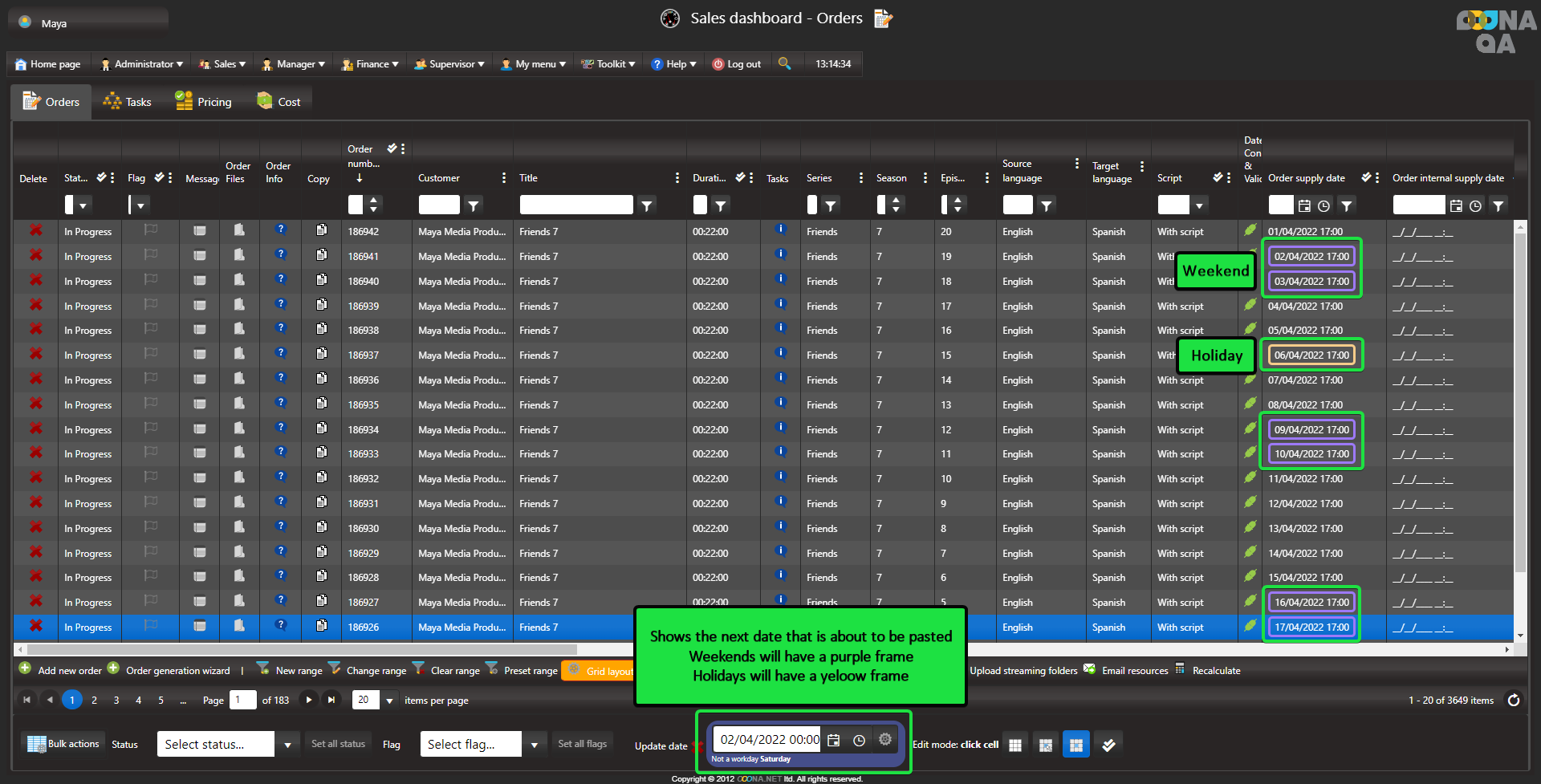 When “Skip over weekends” is off, you can still set delivery dates to weekend days, but colorful frames will be added to the date field to let you know that you scheduled delivery date on a weekend or a holiday.