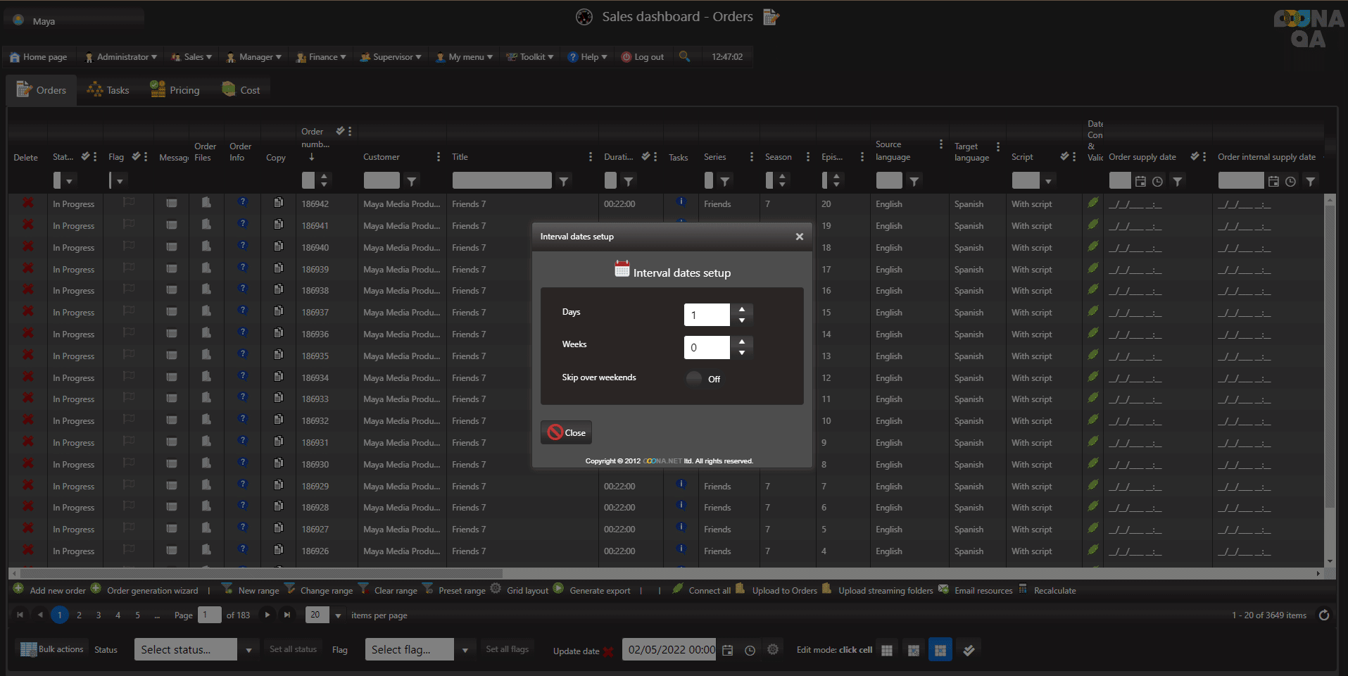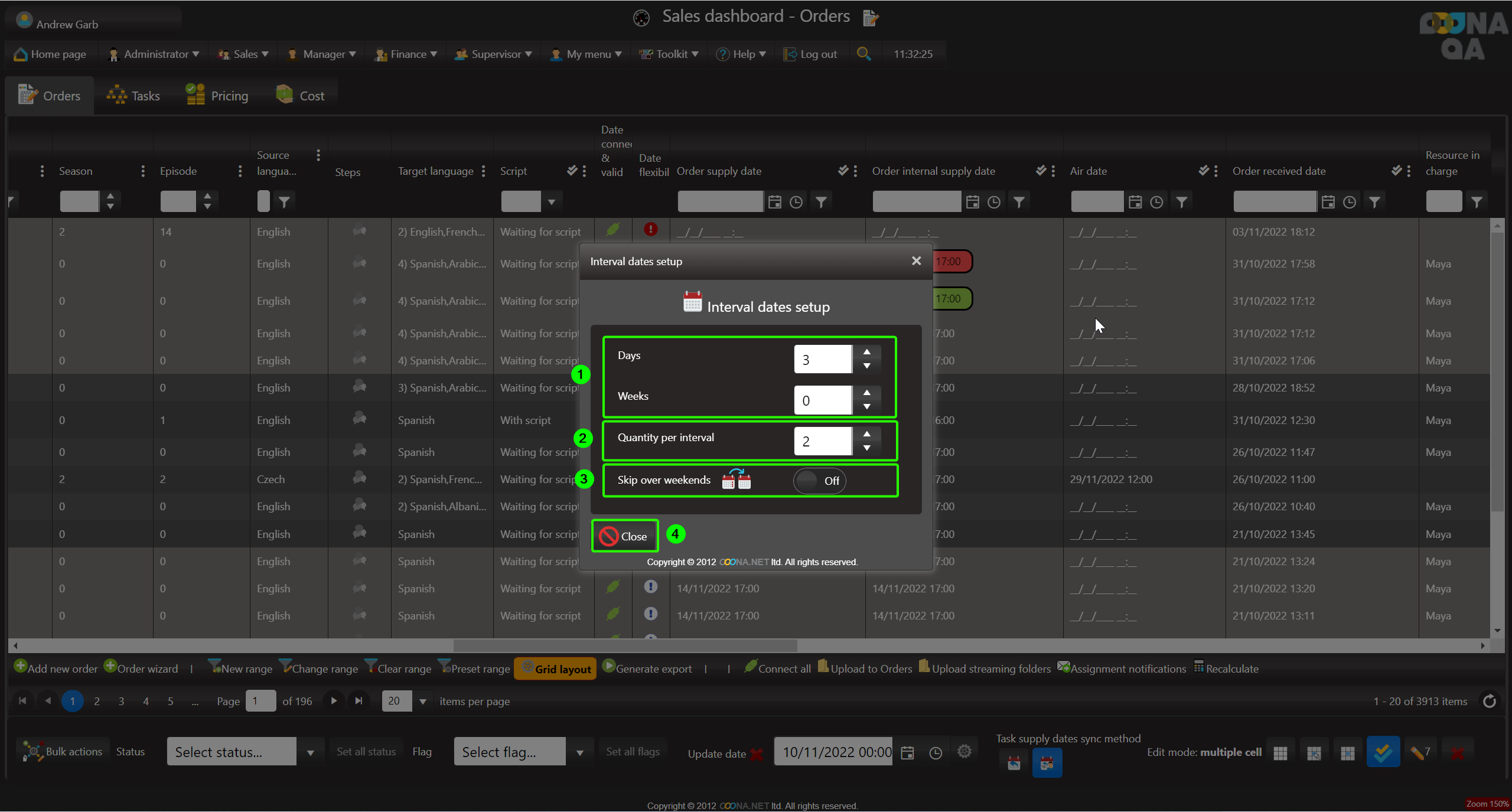 Interval dates are delivery dates with equal gaps between them, for example, delivering a task/order every day, 5 episodes a day, an episode every 2 days, once a week, etc…