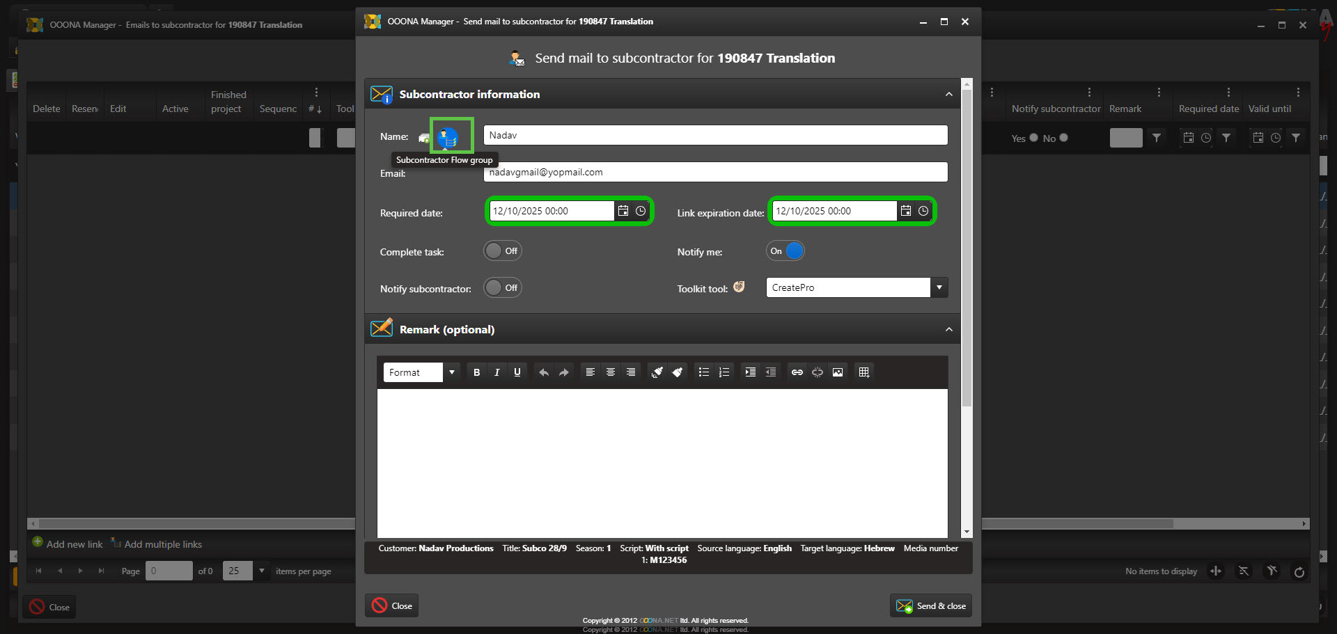 Click the "Send and close" button at the bottom right to send the first subcontractor email and start the group flow.