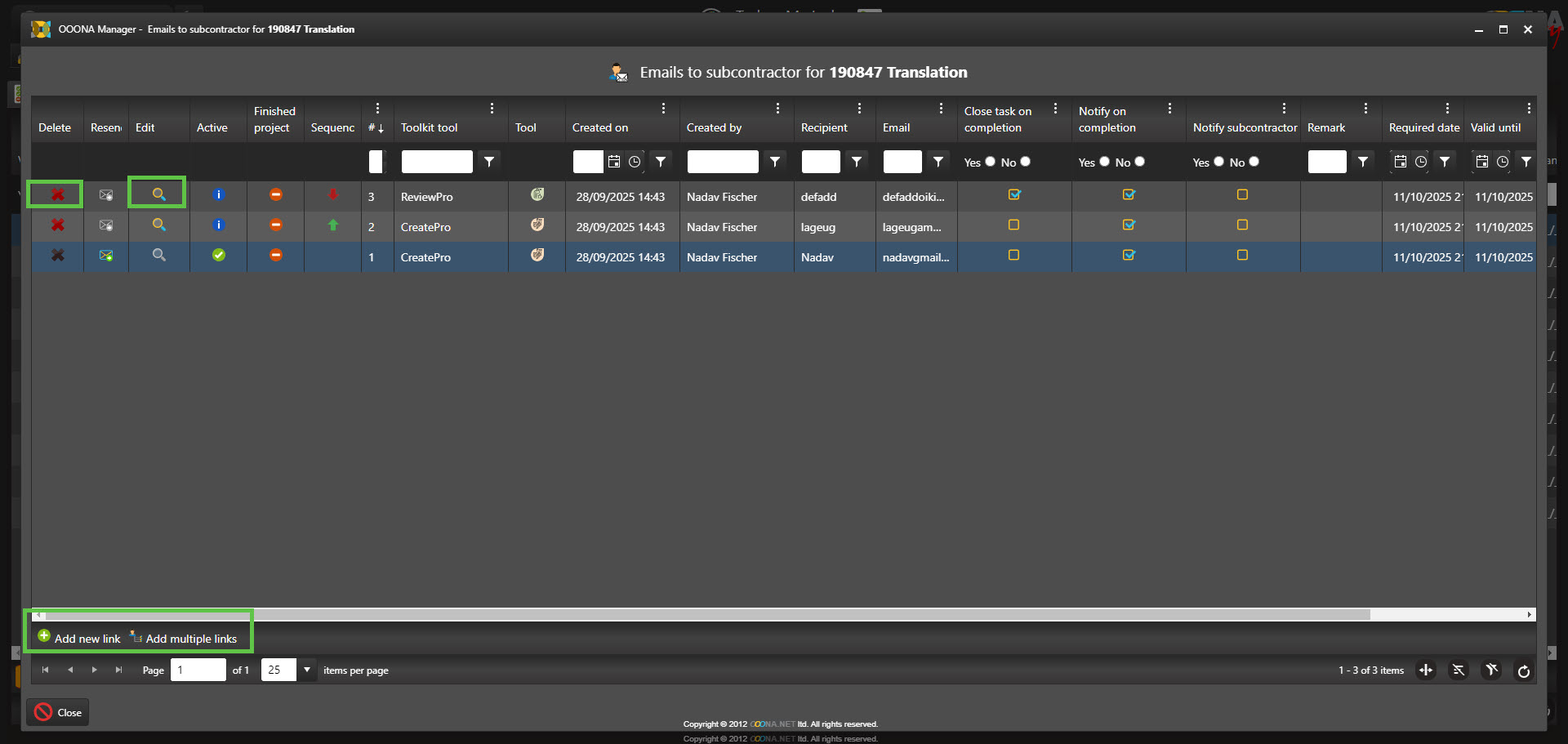 You can also create multiple sequential subcontractor links from one task, allowing you to create a mini-flow within the original task and assign each link to a different subcontractor. The links created will work similarly to tasks in the regular order flow: each can be sent to a different subcontractor, have its own due date, and its own toolkit tool. The project created by the first subcontractor will flow to the next one when the first clicks "Finish project", and so on until the last subcontractor in the list.