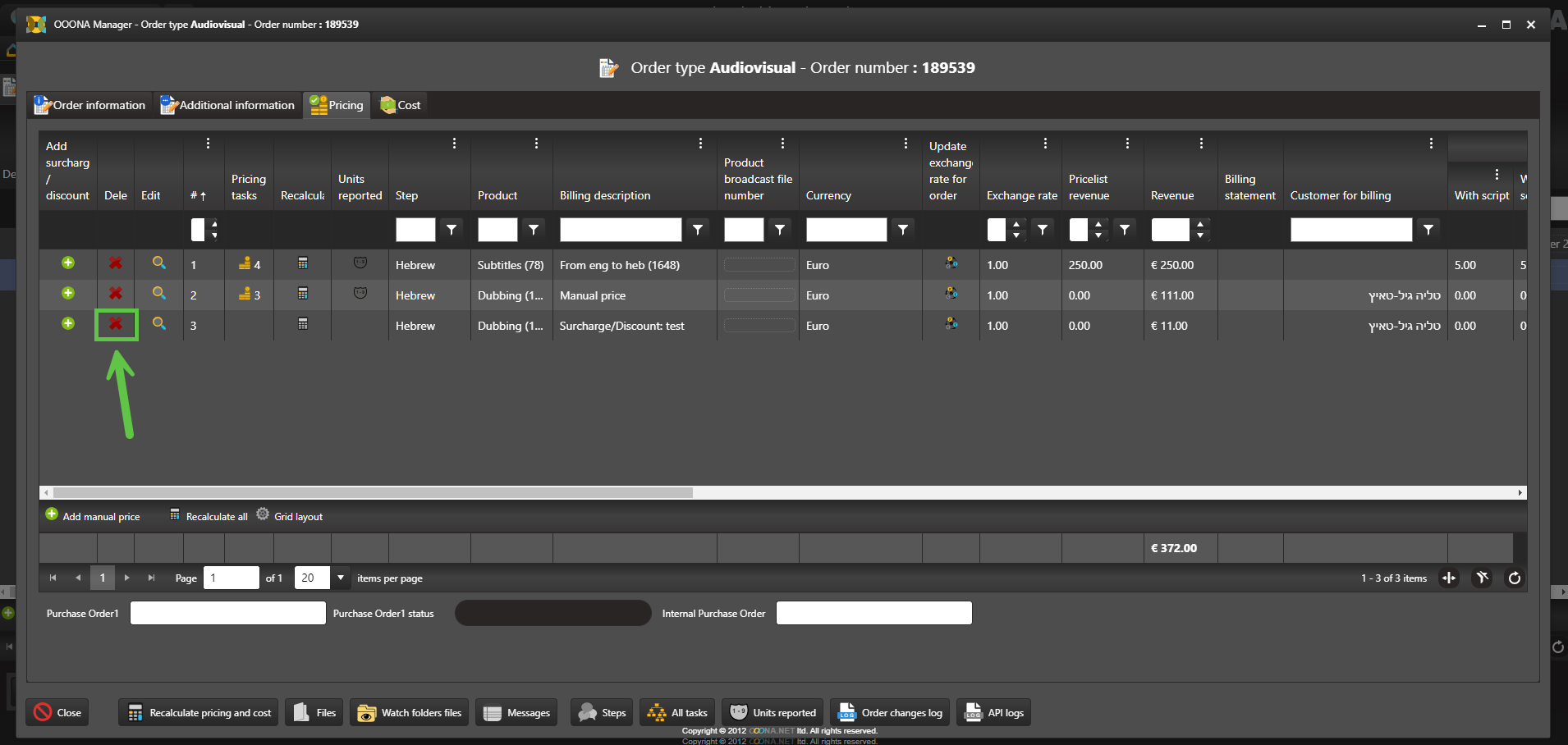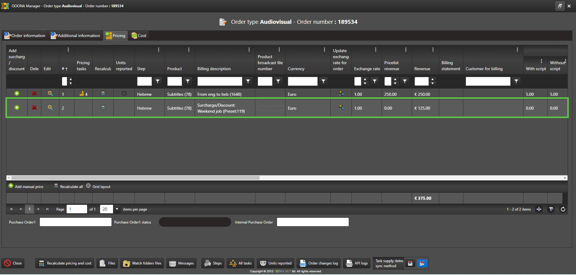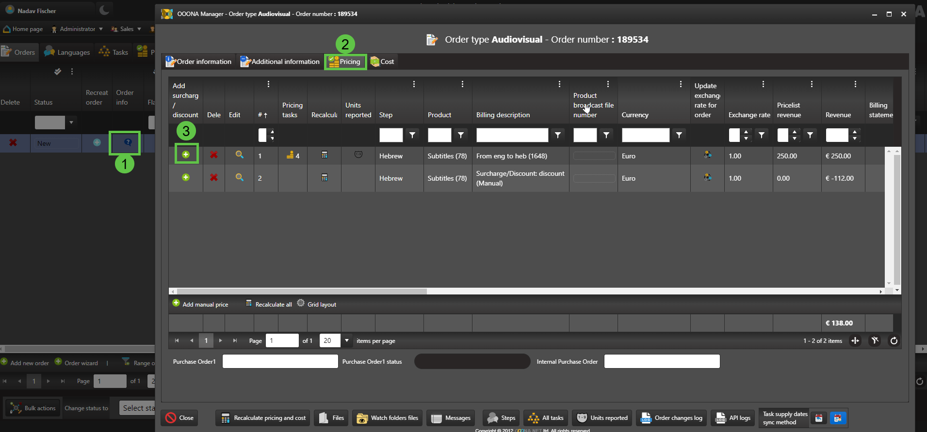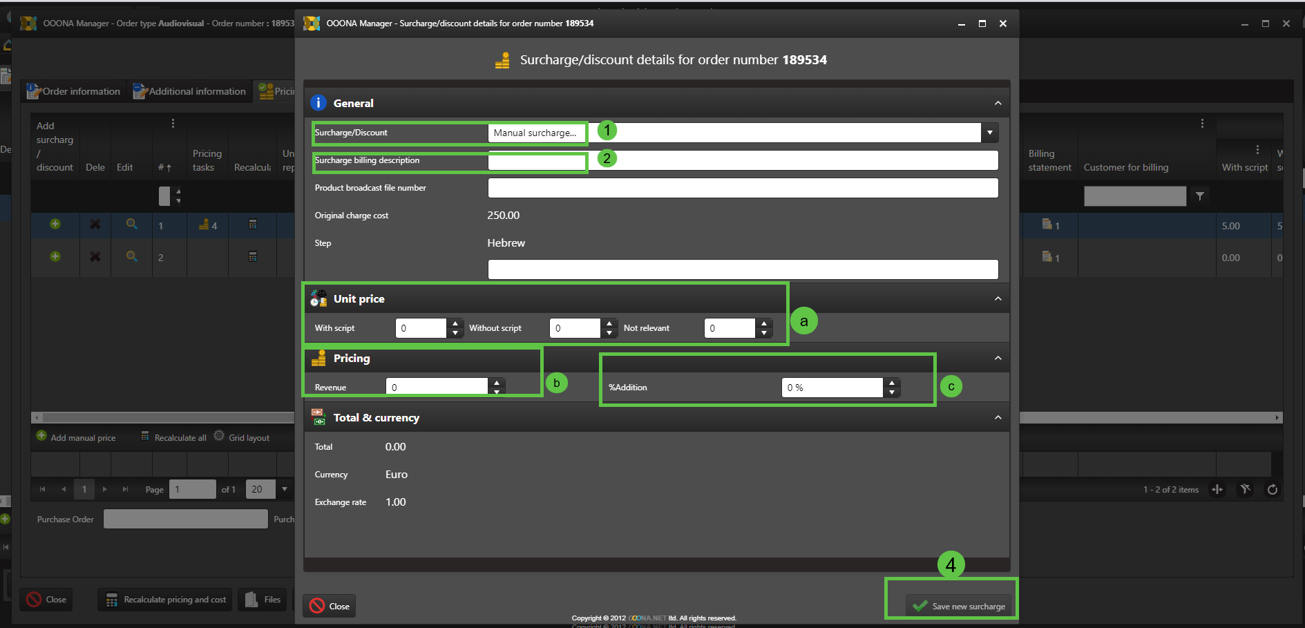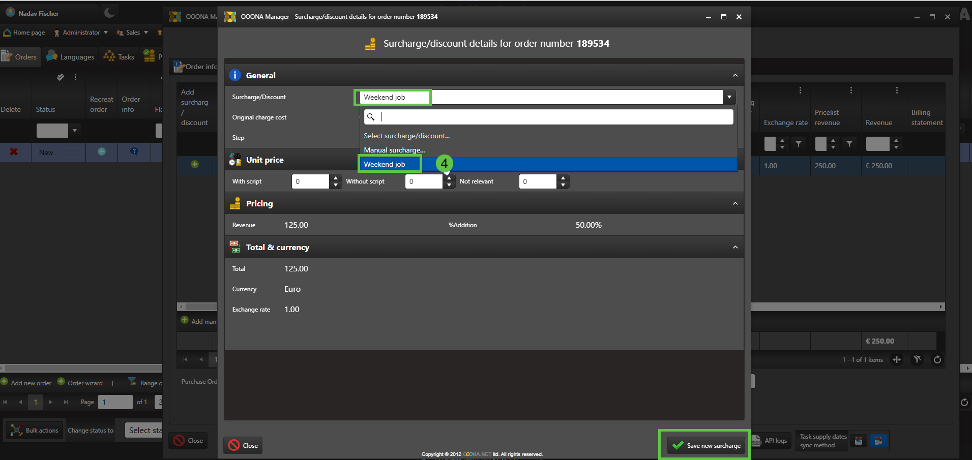 To add a manual price surcharge to a single order, navigate to the pricing tab of the order, click the Add surcharge button and follow these steps:
