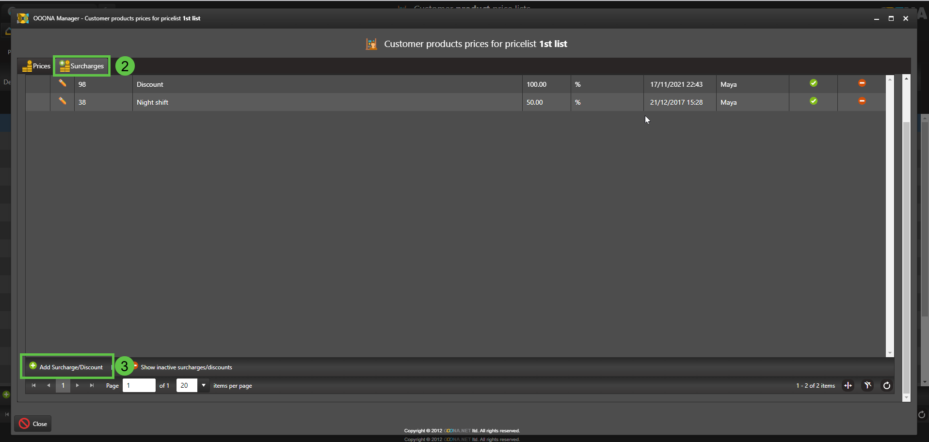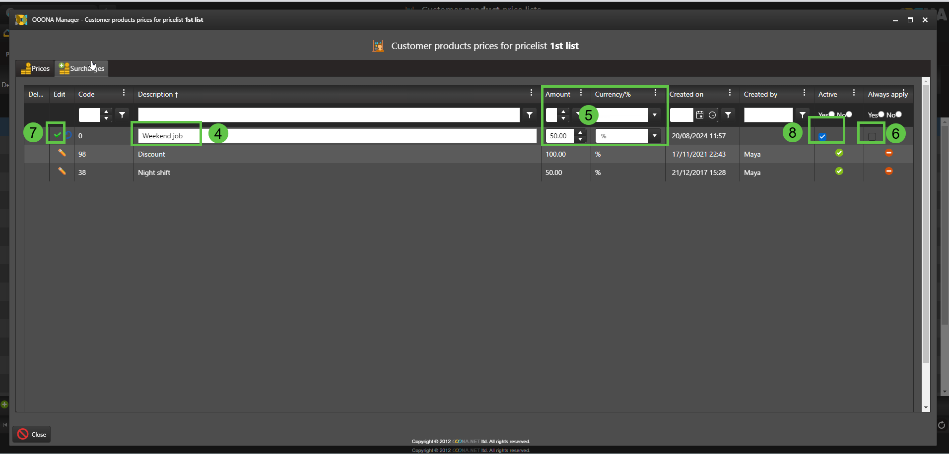 Preset surcharges are created on top of an existing customer product price list, and they provide an easy way of adding identical customer price surcharges each time. More about customer pricelists in the manual.