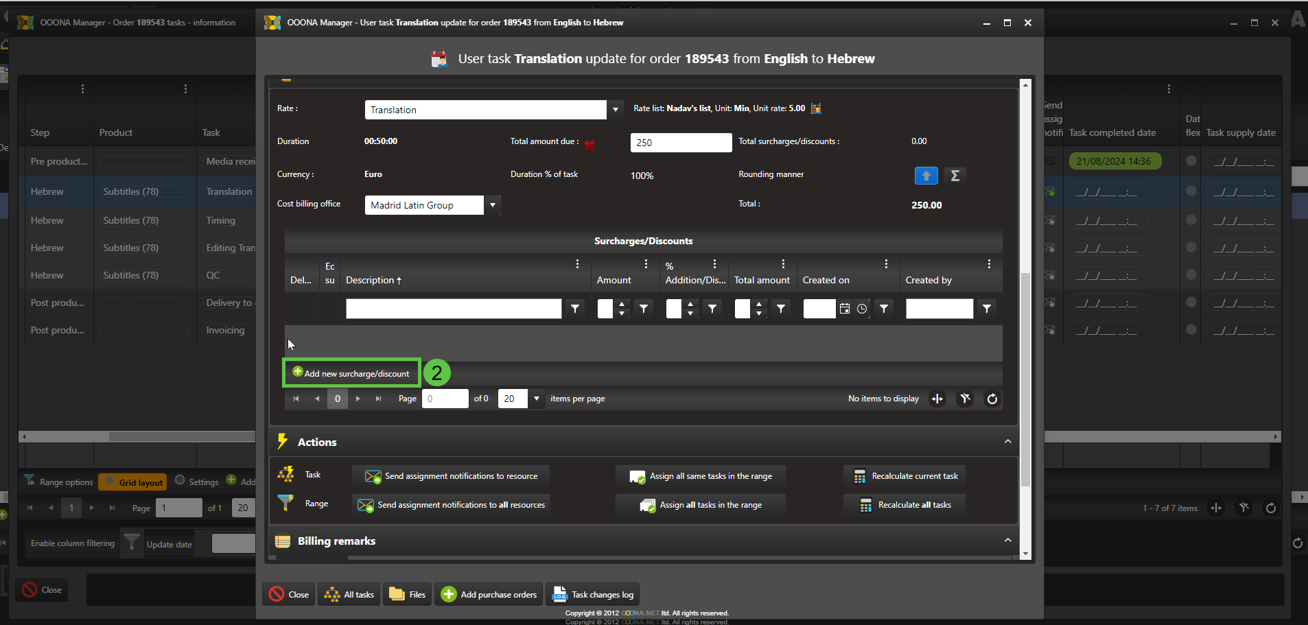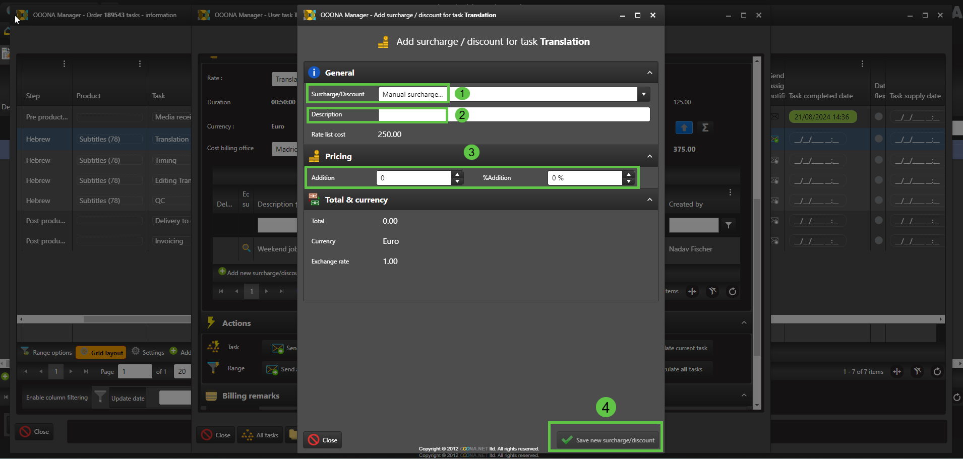 To add a manual rate surcharge to a single task, click the Task Edit button, and the Add New Surcharge/discount button, and then follow these steps:
