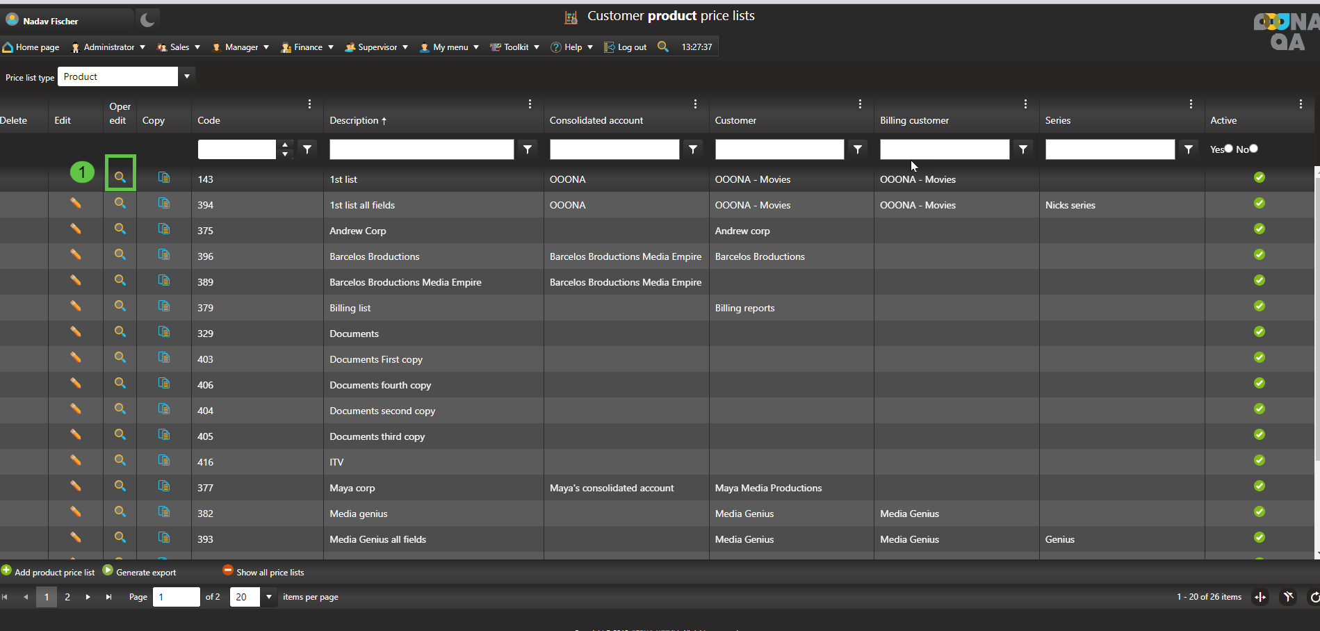 Locate the customer product price list to which you wish to add a preset surcharge, and click the edit icon. (magnifying glass)
