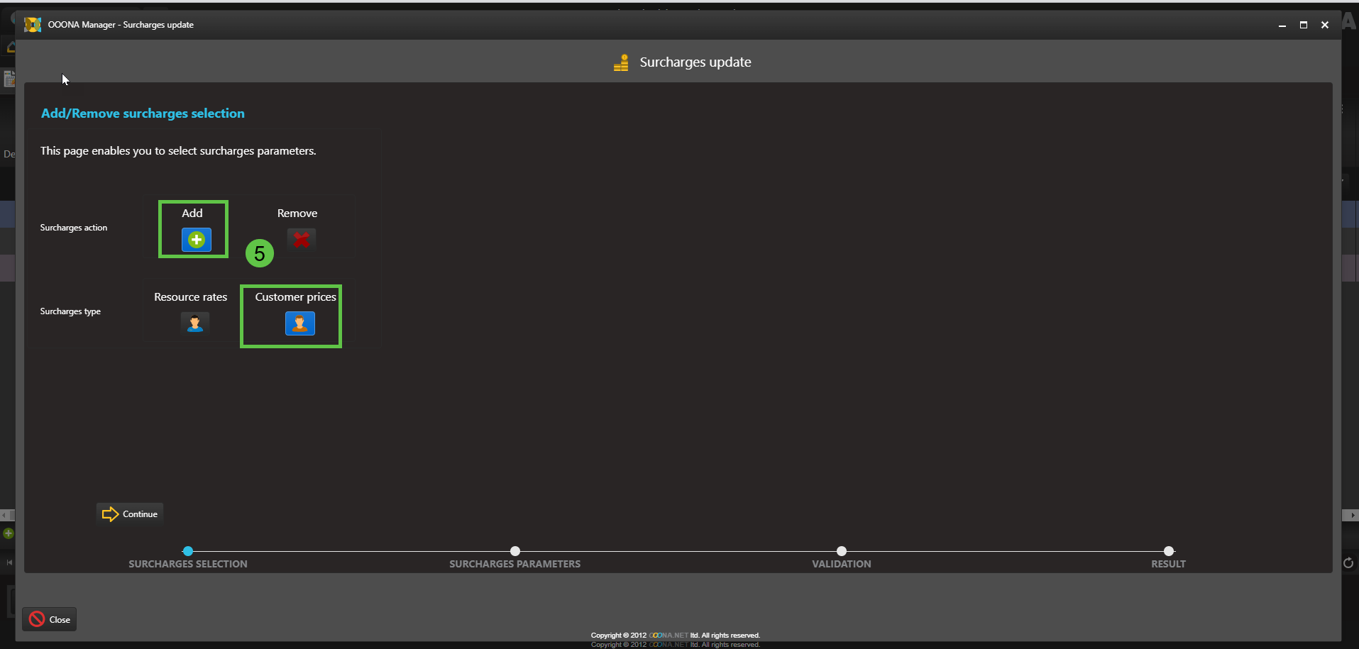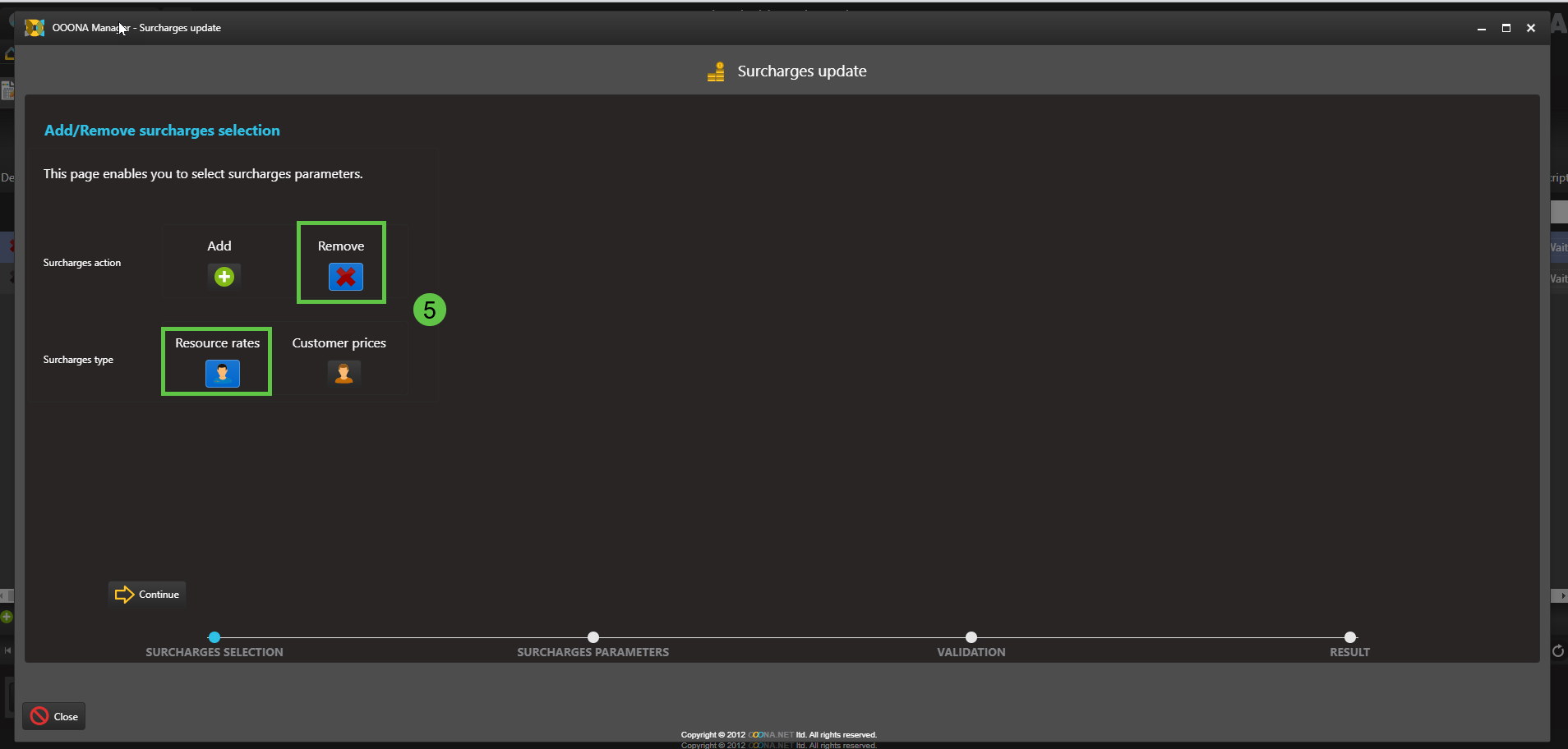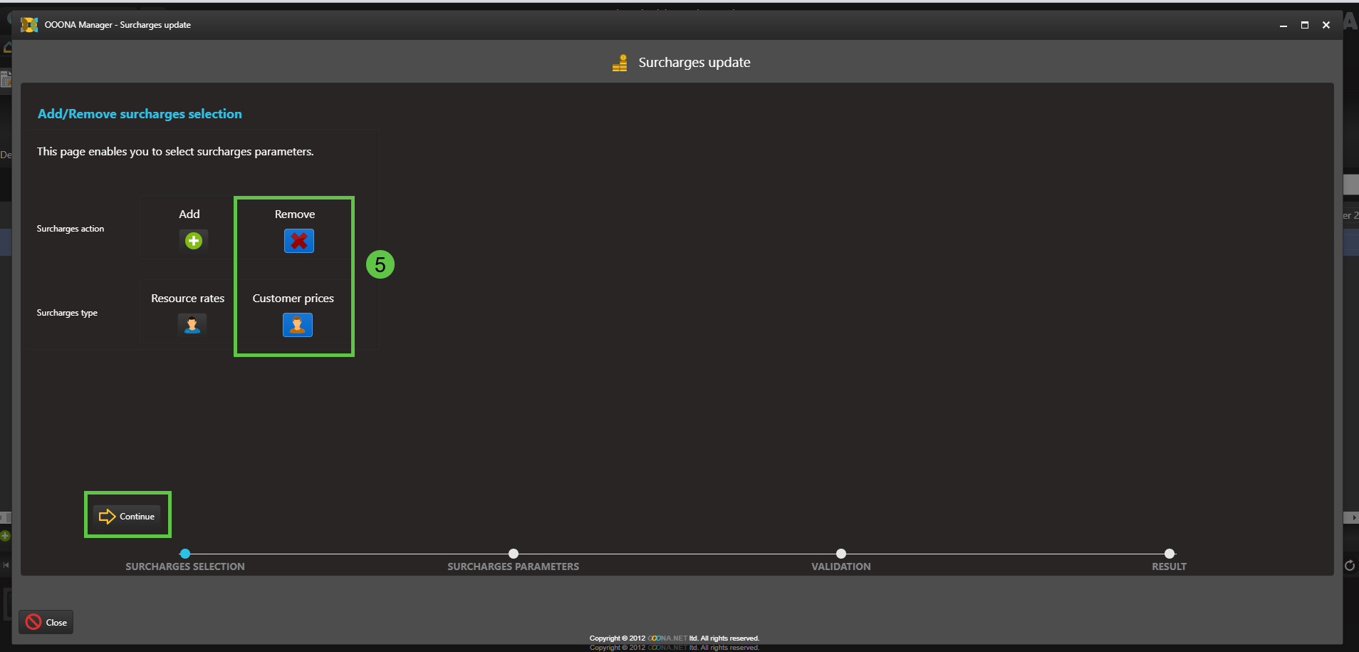 Select Remove and Customer Prices and click Continue (for the other option, see adding surcharges and resource rates).