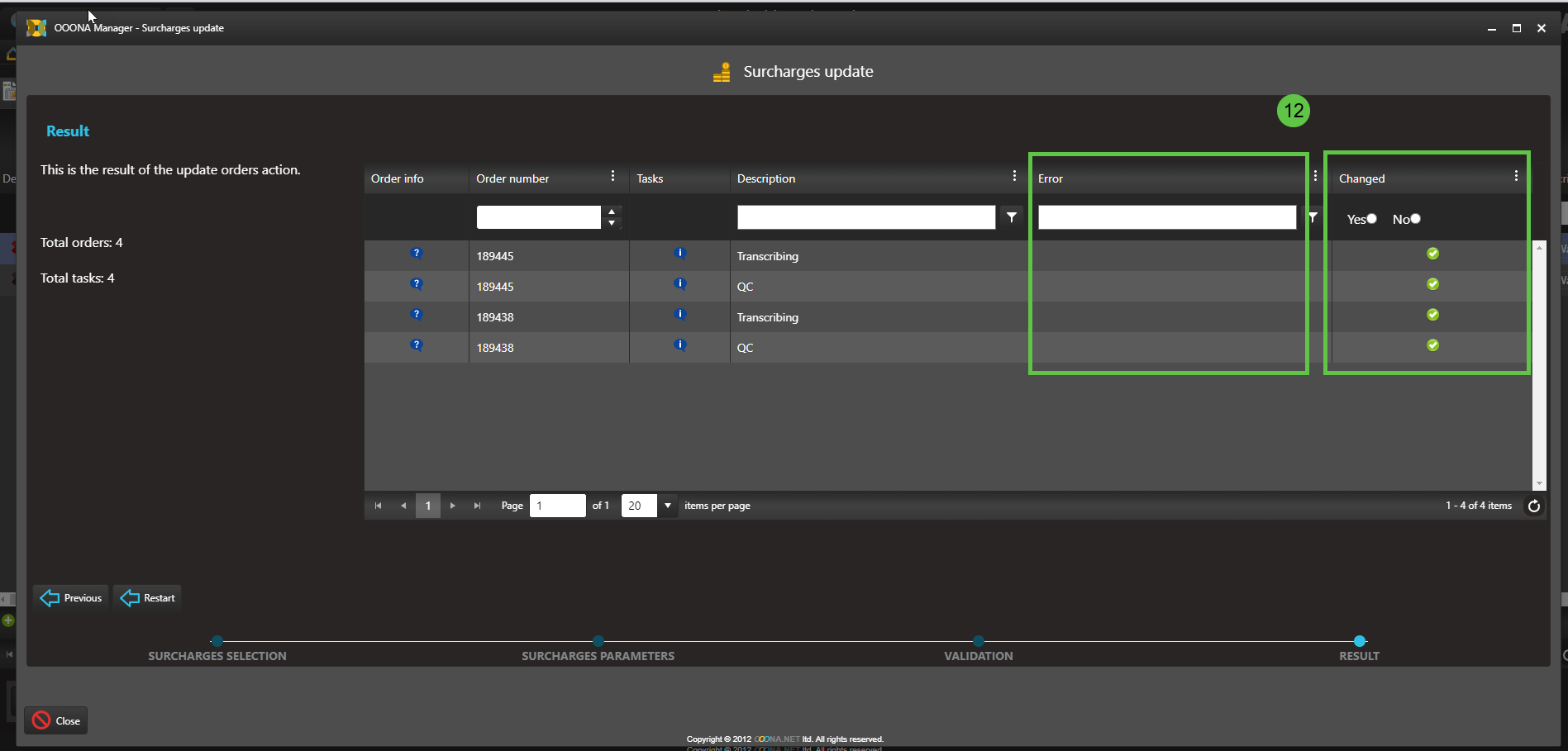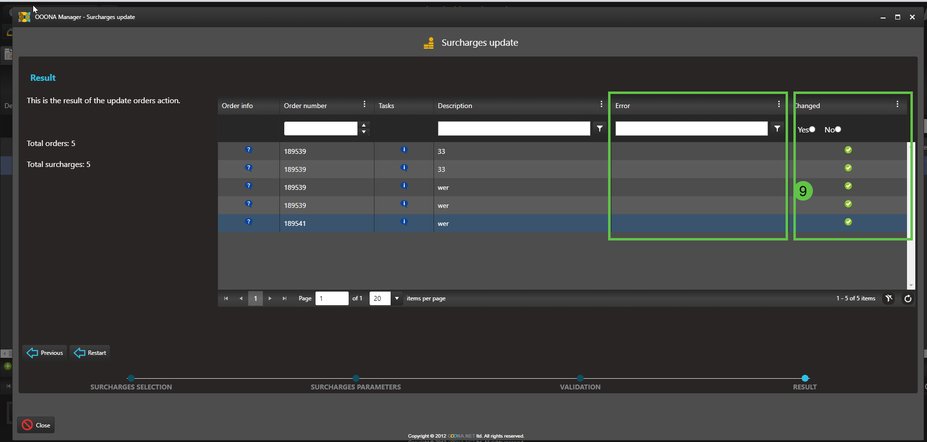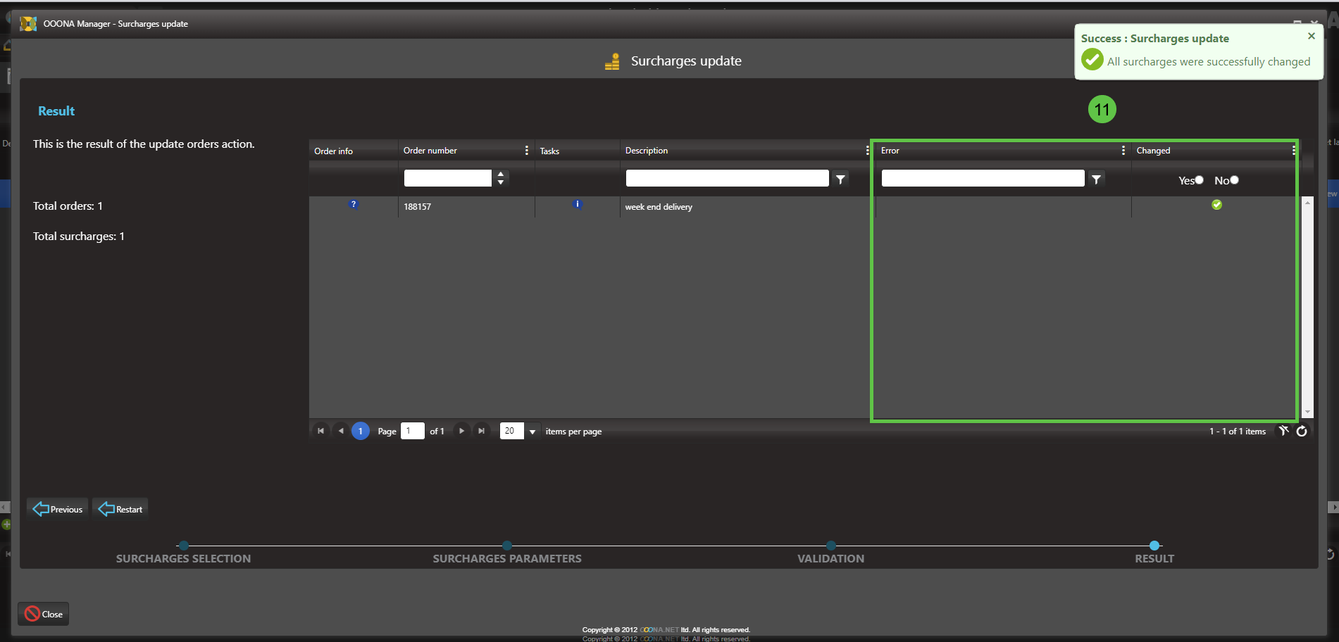 - In the Changed column on the right, the system will display an indication of the surcharges that were removed successfully. If there was an error in one of the orders, it will be detailed in the Error column.