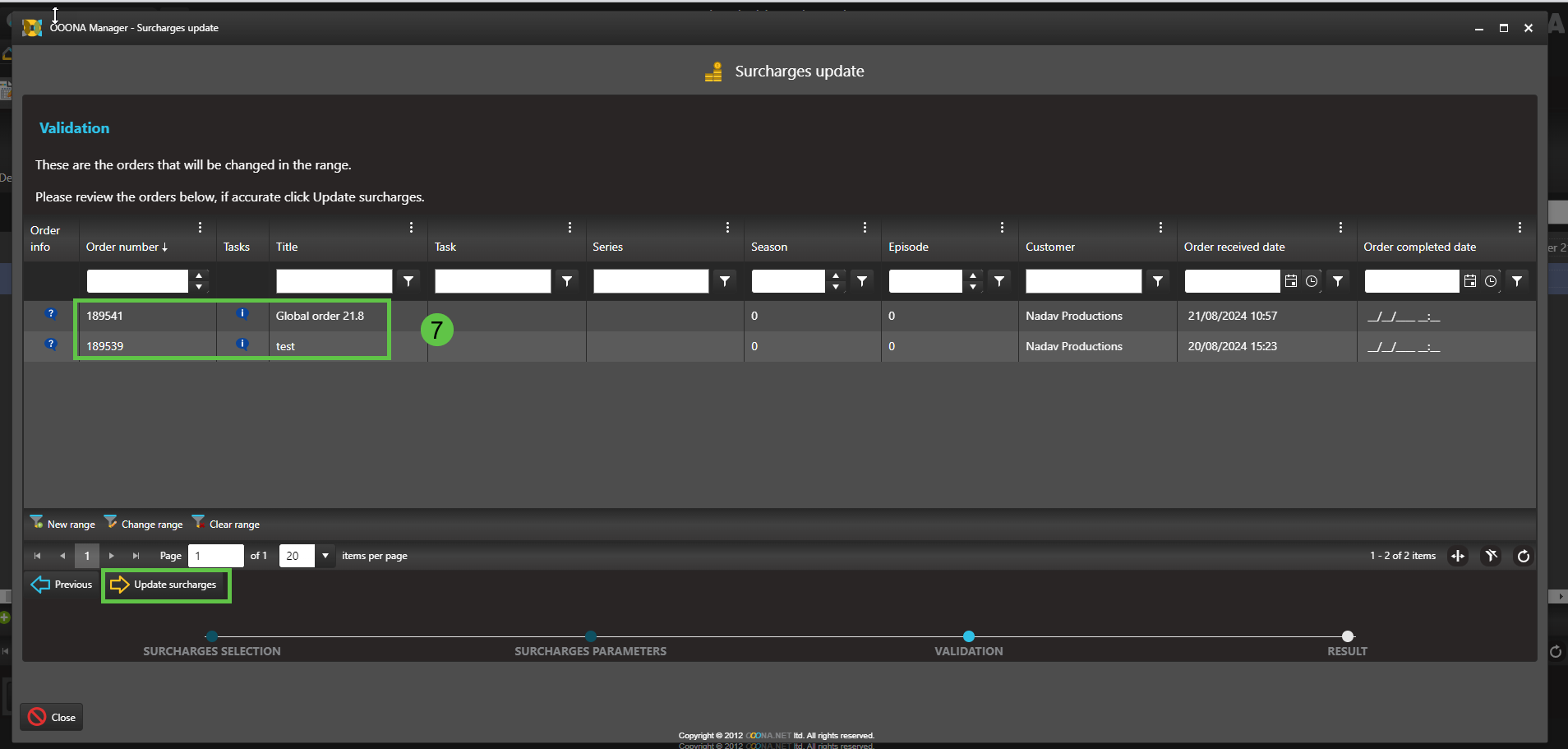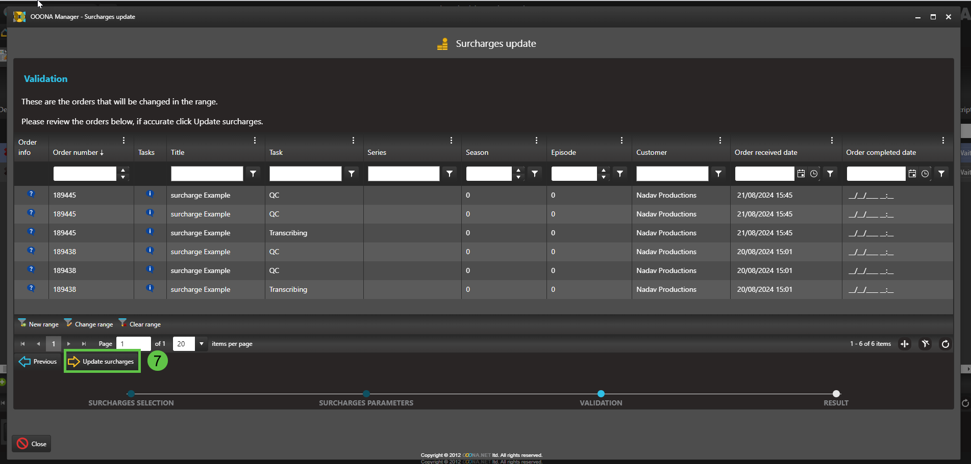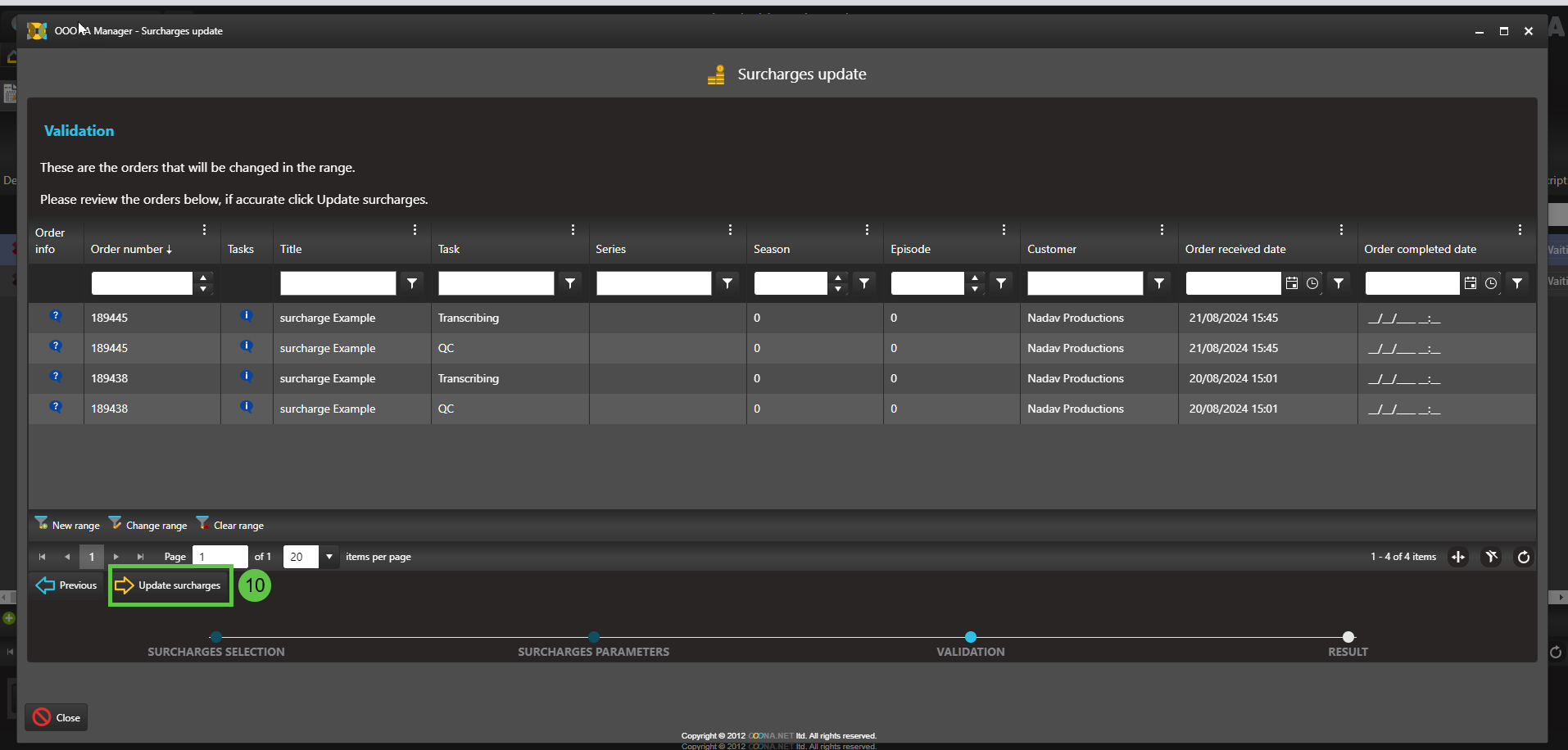 10. In the next screen, confirm that the orders and tasks listed are indeed the ones to be affected, and click Update Surcharge.