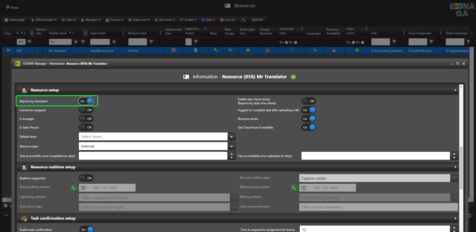 Resource info page > “Reports by timesheet” switch: