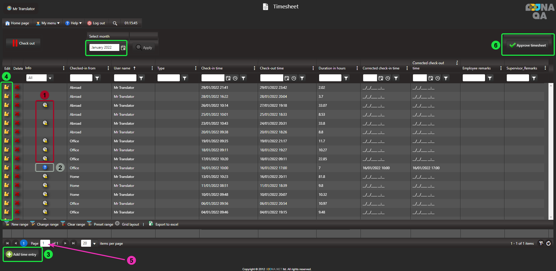 Review and approve your timesheet from: My menu > Timesheet