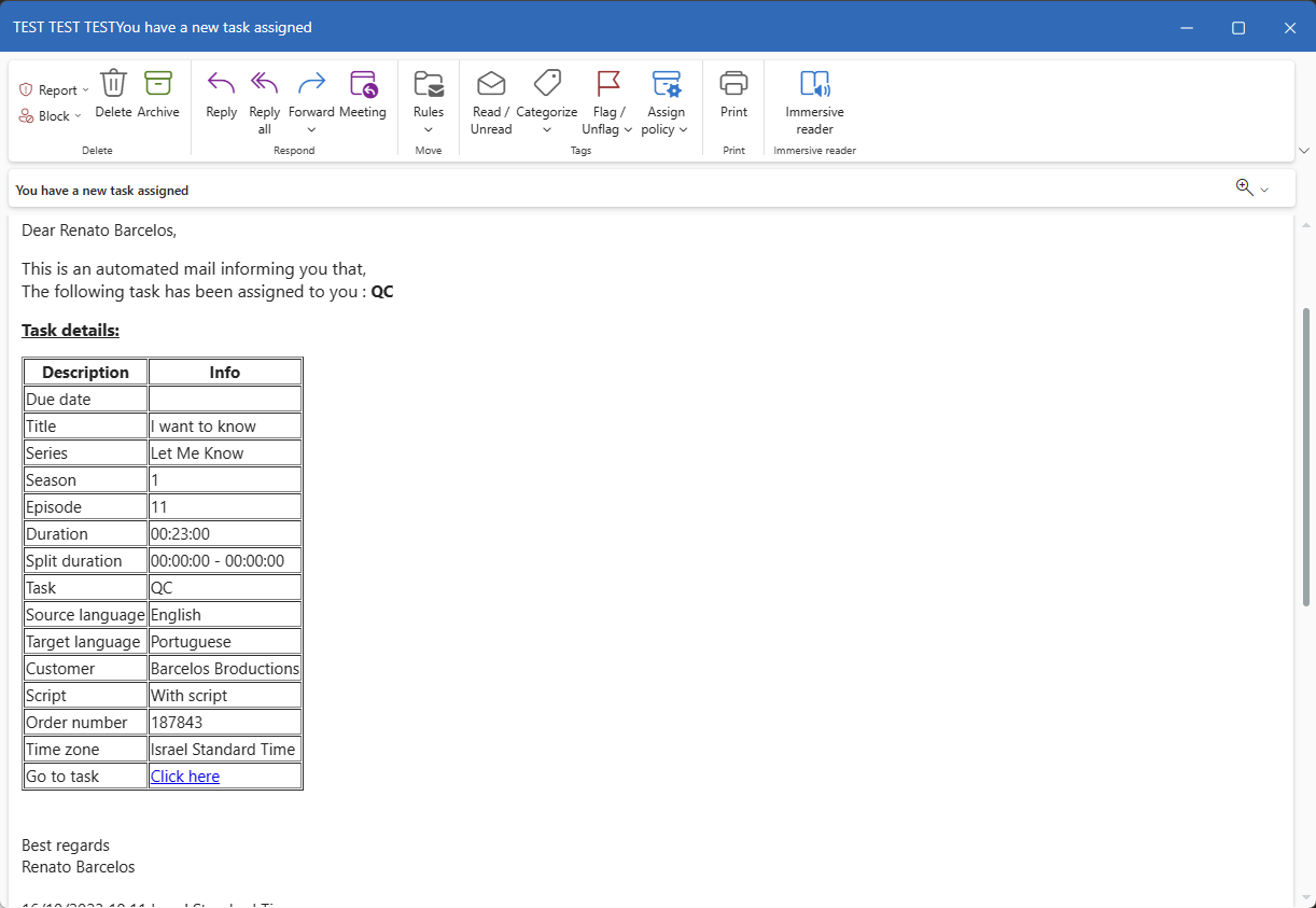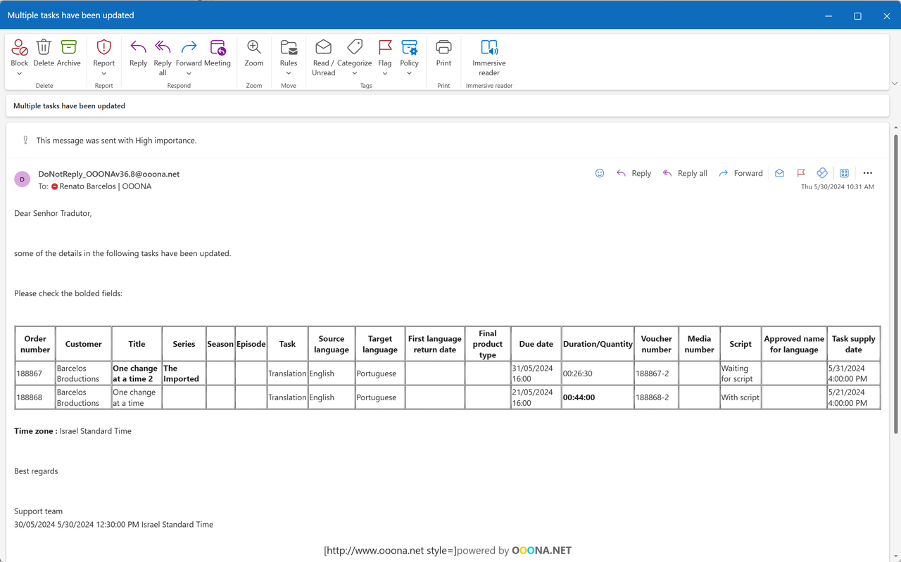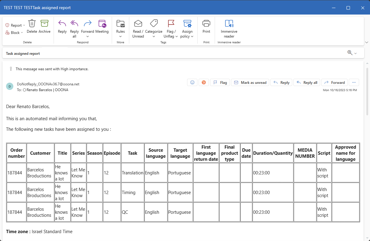 If the user is notified of more than one task at once, the system will send a table with all tasks instead of individual emails for each one: