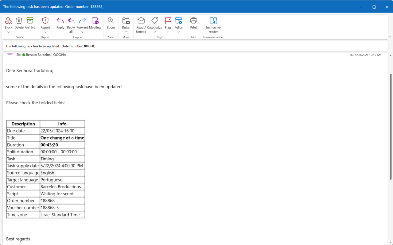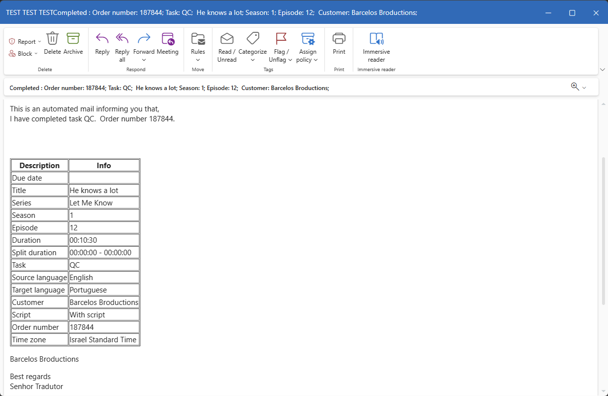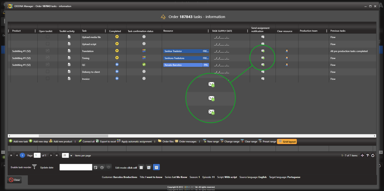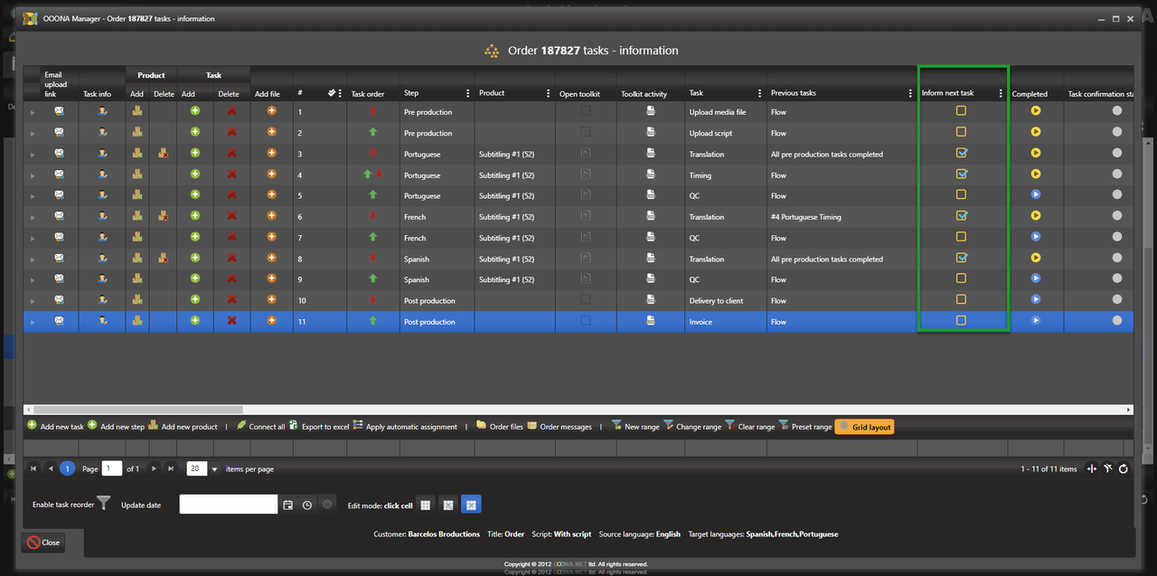 Inform first language - sends a notification to all assigned connected tasks in the first language of the order once all pre-production tasks are completed.